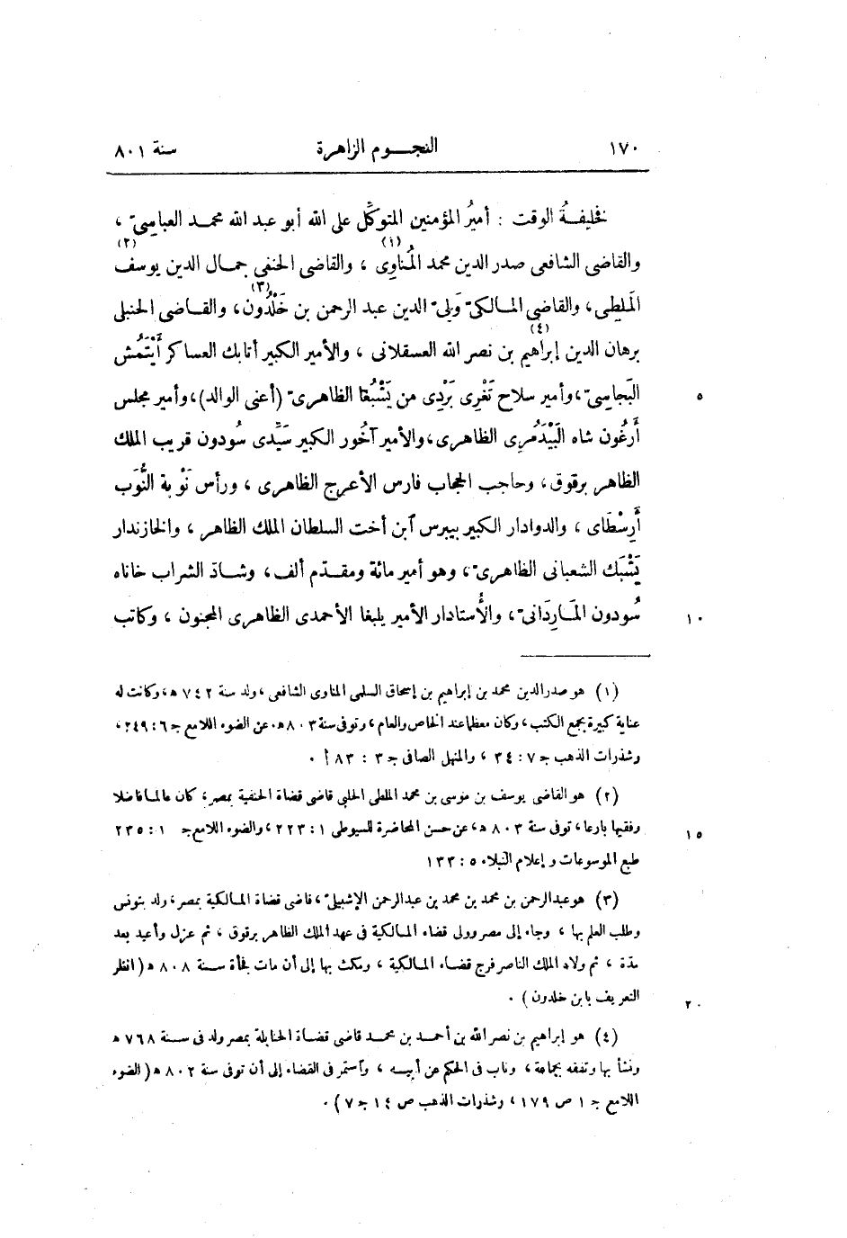 فخليفة الوقت: أمير المؤمنين المتوكّل على الله أبو عبد الله محمد العباسىّ، والقاضى الشافعى صدر الدين محمد المناوى «1» ، والقاضى الحنفى جمال الدين يوسف «2» الملطى، والقاضى المالكىّ ولىّ الدين عبد الرحمن بن خلدون «3» ، والقاضى الحنبلى برهان الدين إبراهيم «4» بن نصر الله العسقلانى، والأمير الكبير أتابك العساكر أيتمش البجاسىّ، وأمير سلاح تغرى بردى من يشبغا الظاهرىّ (أعنى الوالد) ، وأمير مجلس أرغون شاه البيدمرى الظاهرى، والأمير آخور الكبير سيّدى سودون قريب الملك الظاهر برقوق، وحاجب الحجاب فارس الأعرج الظاهرى، ورأس نوبة النّوب أرسطاى، والدوادار الكبير بيبرس ابن أخت السلطان الملك الظاهر، والخازندار يشبك الشعبانى الظاهرىّ، وهو أمير مائة ومقدّم ألف، وشادّ الشراب خاناه سودون الماردانىّ، والأستادار الأمير يلبغا الأحمدى الظاهرى المجنون، وكاتب