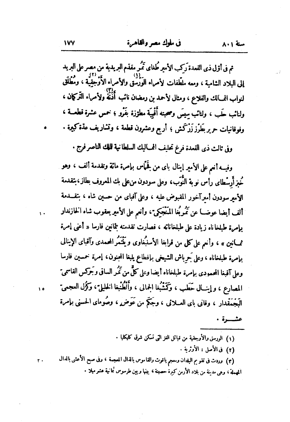 ثم فى أوّل ذى القعدة ركب الأمير طغاى تمر مقدّم البريدية من مصر على البريد إلى البلاد الشامية، ومعه ملطّفات لأمراء الورسق «1» والأمراء الأوجقيّة «2» ، ومطلق لنواب الممالك والقلاع، ومثال لأحمد بن رمضان نائب أذنة «3» ولأمراء التّركمان، ولنائب حلب، ولنائب سيس وصحبته أقبية مطرّزة بفرو؛ خمس عشرة قطعة، وفوقانيات حرير بطرز زركش؛ أربع وعشرون قطعة، وتشاريف عدّة كبيرة.