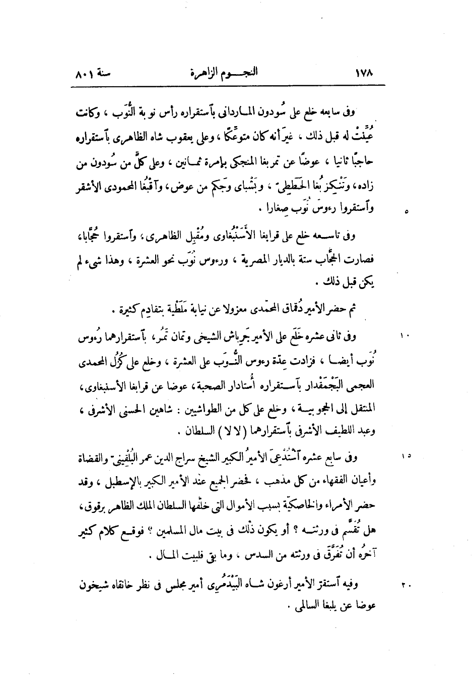 وفى سابع عشره استدعى الأمير الكبير الشيخ سراج الدين عمر البلقينىّ والقضاة وأعيان الفقهاء من كل مذهب، فحضر الجميع عند الأمير الكبير بالإسطبل، وقد حضر الأمراء والخاصكيّة بسبب الأموال التى خلّفها السلطان الملك الظاهر برقوق، هل تقسّم فى ورثته؟ أو يكون ذلك فى بيت مال المسلمين؟ فوقع كلام كثير آخره أن تفرّق فى ورثته من السدس، وما بقى فلبيت المال.