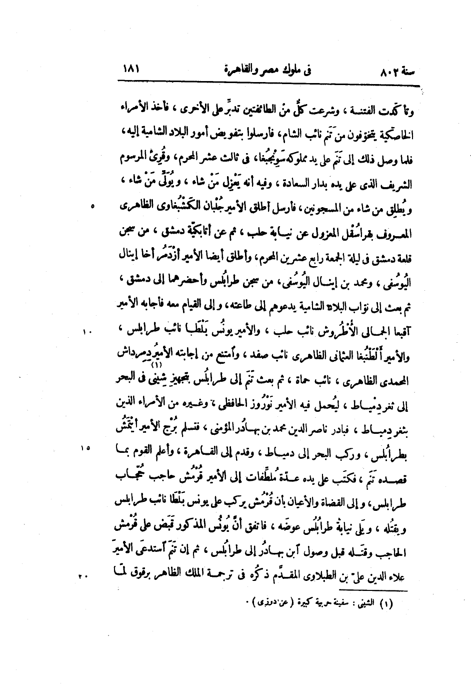 وتأكّدت الفتنة، وشرعت كلّ من الطائفتين تدبّر على الأخرى، فأخذ الأمراء الخاصكيّة يتخوّفون من تنم نائب الشام، فأرسلوا بتفويض أمور البلاد الشامية إليه، فلما وصل ذلك إلى تنم على يد مملوكه سونجبغا، فى ثالث عشر المحرم، وقرئ المرسوم الشريف الذي على يده بدار السعادة، وفيه أنه يعزل من شاء، ويولّى من شاء، ويطلق من شاء من المسجونين، فأرسل أطلق الأمير جلبان الكمشبغاوى الظاهرى المعروف بقراسقل المعزول عن نيابة حلب، ثم عن أتابكيّة دمشق، من سجن قلعة دمشق فى ليلة الجمعة رابع عشرين المحرم، وأطلق أيضا الأمير أزدمر أخا إينال اليوسفى، ومحمد بن إينال اليوسفى، من سجن طرابلس وأحضرهما إلى دمشق، ثم بعث إلى نوّاب البلاد الشامية يدعوهم إلى طاعته، وإلى القيام معه فأجابه الأمير آقبغا الجمالى الأطروش نائب حلب، والأمير يونس بلطبا نائب طرابلس، والأمير ألطنبغا العثمانى الظاهرى نائب صفد، وامتنع من إجابته الأمير دمرداش المحمدى الظاهرى، نائب حماة، ثم بعث تنم إلى طرابلس بتجهيز شينى «1» فى البحر إلى ثغردمياط، ليحمل فيه الأمير نوروز الحافظى، وغيره من الأمراء الذين بثغردمياط، فبادر ناصر الدين محمد بن بهادر المؤمنى، فتسلم برج الأمير أيتمش بطرابلس، وركب البحر إلى دمياط، وقدم إلى القاهرة، وأعلم القوم بما قصده تنم، فكتب على يده عدّة ملطّفات إلى الأمير قرمش حاجب حجّاب طرابلس، وإلى القضاة والأعيان بأن قرمش يركب على يونس بلطا نائب طرابلس ويقتله، ويلى نيابة طرابلس عوضه، فاتفق أنّ يونس المذكور قبض على قرمش الحاجب وقتله قبل وصول ابن بهادر إلى طرابلس، ثم إن تنم استدعى الأمير علاء الدين علىّ بن الطبلاوى المقدّم ذكره فى ترجمة الملك الظاهر برقوق لمّا