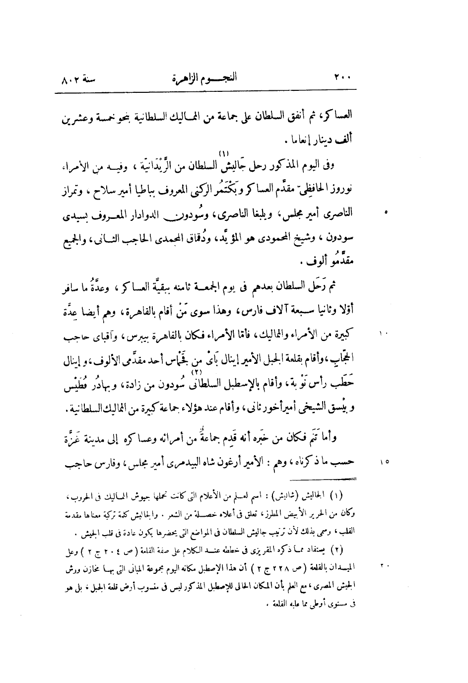 ثم رحل السلطان بعدهم فى يوم الجمعة ثامنه ببقيّة العساكر، وعدّة ما سافر أوّلا وثانيا سبعة آلاف فارس، وهذا سوى من أقام بالقاهرة، وهم أيضا عدّة كبيرة من الأمراء والمماليك، فأمّا الأمراء فكان بالقاهرة بيبرس، وآقباى حاجب الحجّاب، وأقام بقلعة الجبل الأمير إينال باى من قجماس أحد مقدّمى الألوف، وإينال حطب رأس نوبة، وأقام بالإسطبل السلطانى «2» سودون من زادة، وبهادر؟؟؟ طيس وبيسق الشيخى أمير أخور ثانى، وأقام عند هؤلاء جماعة كبيرة من المماليك السلطانية.