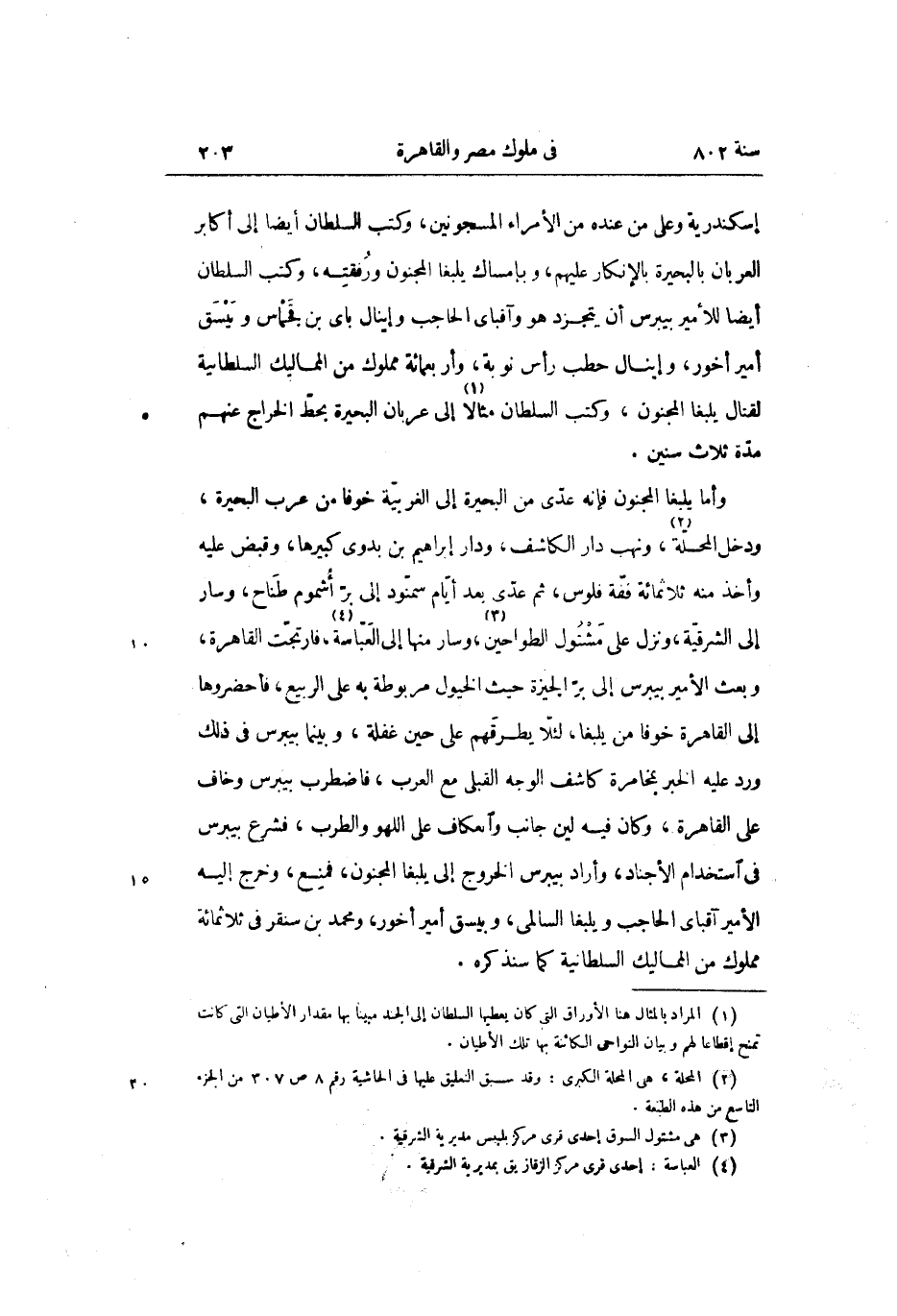 إسكندرية وعلى من عنده من الأمراء المسجونين، وكتب السلطان أيضا إلى أكابر العربان بالبحيرة بالإنكار عليهم، وبإمساك يلبغا المجنون ورفقته، وكتب السلطان أيضا للأمير بيبرس أن يتجرد هو وآقباى الحاجب وإينال باى بن قجماس ويسق أمير أخور، وإينال حطب رأس نوبة، وأربعمائة مملوك من المماليك السلطانية لقتال يلبغا المجنون، وكتب السلطان مثالا «1» إلى عربان البحيرة بحطّ الخراج عنهم مدّة ثلاث سنين.