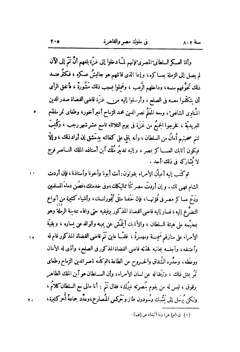 وأمّا العسكر السلطانىّ المصرىّ فإنهم لمّا دخلوا إلى غزّة بلغهم أنّ تنم إلى الآن لم يصل إلى الرّملة بعساكره، وإنما الذي قاتلهم هو جاليش عسكره، فكثر عند ذلك تخوّفهم منه، وداخلهم الرّعب، وعملوا بسبب ذلك مشورة، فاتفق الرأى أن يتكلّموا معه فى الصلح، وأرسلوا إليه من غزّة قاضى القضاة صدر الدين المناوى الشافعىّ، ومعه المعلّم نصر الدين محمد الرّماح أمير أخور، وطغاى تمر مقدّم البريديّة، فخرجوا الجميع من غزّة فى يوم الثلاثاء تاسع عشر شهر رجب، وكتب لتنم صحبتهم أمان من السلطان، وأنه باق على كفالته بدمشق إن أراد ذلك، وإلّا فيكون أتابك العساكر بمصر، وإليه تدبير ملك ابن أستاذه الملك الناصر فرج لا يشاركه فى ذلك أحد.