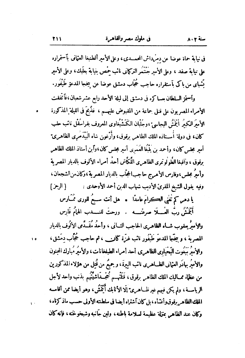 والأمير يعقوب شاه الظاهرى الحاجب الثانى، وأحد مقدّمى الألوف بالديار المصرية، وبيخجا المدعو طيفور نائب غزّة كان، ثم حاجب حجّاب دمشق، والأمير بيغوت اليحياوى الظاهرى أحد أمراء الطبلخانات، والأمير مبارك المجنون والأمير بهادر العثمانى الظاهرى نائب البيرة، وجميع من قتل من هؤلاء المذكورين من عظماء مماليك الملك الظاهر برقوق، قتلتهم خجداشيّتهم بذنب واحد لأجل الرياسة، ولم يكن فيهم غير ظاهرىّ إلّا الأتابك أيتمش، وهو أيضا ممن أقامه الملك الظاهر برقوق وأنشأه، بل كان اشتراه أيضا فى سلطنته الأولى حسب ما ذكرناه، وكان عند الظاهر بمنزلة عظيمة لسلامة باطنه، ولين جانبه وشيخوخته، فإنه كان