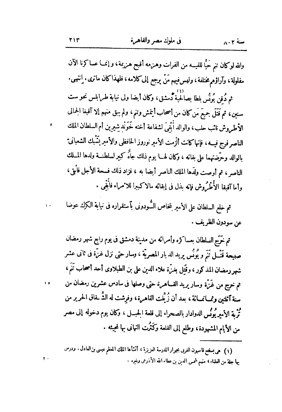 ثم خرج السلطان بعساكره وأمرائه من مدينة دمشق فى يوم رابع شهر رمضان صبيحة قتل تنم ويونس يريد الديار المصريّة، وسار حتى نزل غزّة فى ثانى عشر شهر رمضان المذكور، وقتل بغزّة علاء الدين على بن الطبلاوى أحد أصحاب تنم، ثم خرج من غزّة وسار يريد القاهرة حتى وصلها فى سادس عشرين رمضان من سنة اثنتين وثمانمائة، بعد أن زيّنت القاهرة، وفرشت له الشّقاق الحرير من تربة الأمير يونس الدوادار بالصحراء إلى قلعة الجبل، وكان يوم دخوله إلى مصر من الأيام المشهودة، وطلع إلى القلعة وكثرت التهانى بها لمجيئه.