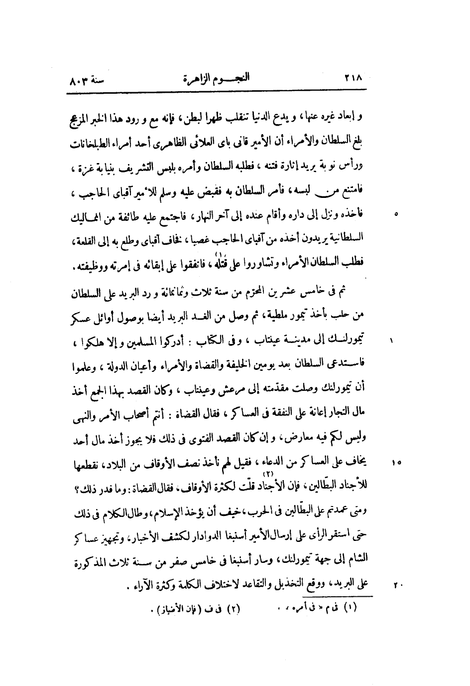 ثم فى خامس عشرين المحرّم من سنة ثلاث وثمانمائة ورد البريد على السلطان من حلب بأخذ تيمور ملطية، ثم وصل من الغد البريد أيضا بوصول أوائل عسكر تيمور لنك إلى مدينة عينتاب، وفى الكتاب: أدركوا المسلمين وإلا هلكوا، فاستدعى السلطان بعد يومين الخليفة والقضاة والأمراء وأعيان الدولة، وعلموا أن تيمور لنك وصلت مقدّمته إلى مرعش وعينتاب، وكان القصد بهذا الجمع أخذ مال التجار إعانة على النفقة فى العساكر، فقال القضاة: أنتم أصحاب الأمر والنهى وليس لكم فيه معارض، وإن كان القصد الفتوى فى ذلك فلا يجوز أخذ مال أحد يخاف على العساكر من الدعاء، فقيل لهم نأخذ نصف الأوقاف من البلاد، نقطعها للأجناد البطّالين، فإن الأجناد «2» قلّت لكثرة الأوقاف، فقال القضاة: وما قدر ذلك؟