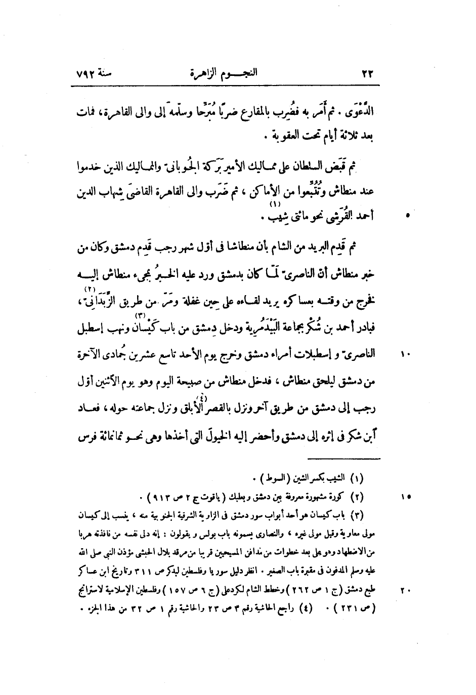 ثم قدم البريد من الشام بأن منطاشا فى أوّل شهر رجب قدم دمشق وكان من خبر منطاش أنّ الناصرىّ لمّا كان بدمشق ورد عليه الخبر بمجيء منطاش إليه فخرج من وقته بعساكره يريد لقاءه على حين غفلة ومرّ من طريق الزّبدانىّ «2» ، فبادر أحمد بن شكر بجماعة البيدمرية ودخل دمشق من باب كيسان «3» ونهب إسطبل الناصرىّ وإسطبلات أمراء دمشق وخرج يوم الأحد تاسع عشرين جمادى الآخرة من دمشق ليلحق منطاش، فدخل منطاش من صبيحة اليوم وهو يوم الاثنين أوّل رجب إلى دمشق من طريق آخر ونزل بالقصر «4» الأبلق ونزل جماعته حوله، فعاد ابن شكر فى إثره إلى دمشق وأحضر إليه الخيول التى أخذها وهى نحو ثمانمائة فرس