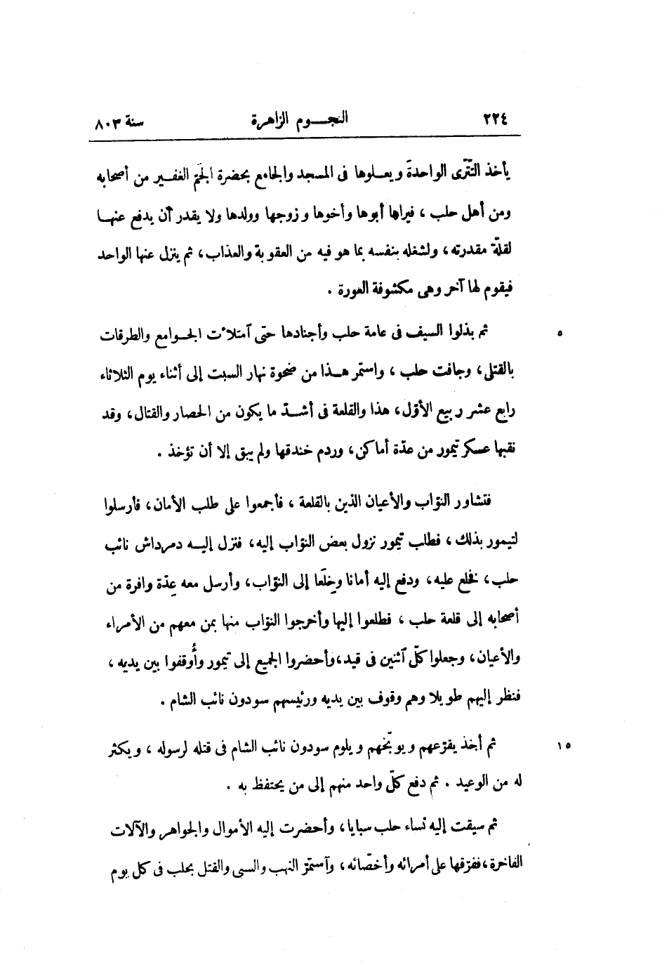 فتشاور النوّاب والأعيان الذين بالقلعة، فأجمعوا على طلب الأمان، فأرسلوا لتيمور بذلك، فطلب تيمور نزول بعض النوّاب إليه، فنزل إليه دمرداش نائب حلب، فخلع عليه، ودفع إليه أمانا وخلعا إلى النوّاب، وأرسل معه عدّة وافرة من أصحابه إلى قلعة حلب، فطلعوا إليها وأخرجوا النوّاب منها بمن معهم من الأمراء والأعيان، وجعلوا كلّ اثنين فى قيد، وأحضروا الجميع إلى تيمور وأوقفوا بين يديه، فنظر إليهم طويلا وهم وقوف بين يديه ورئيسهم سودون نائب الشام.