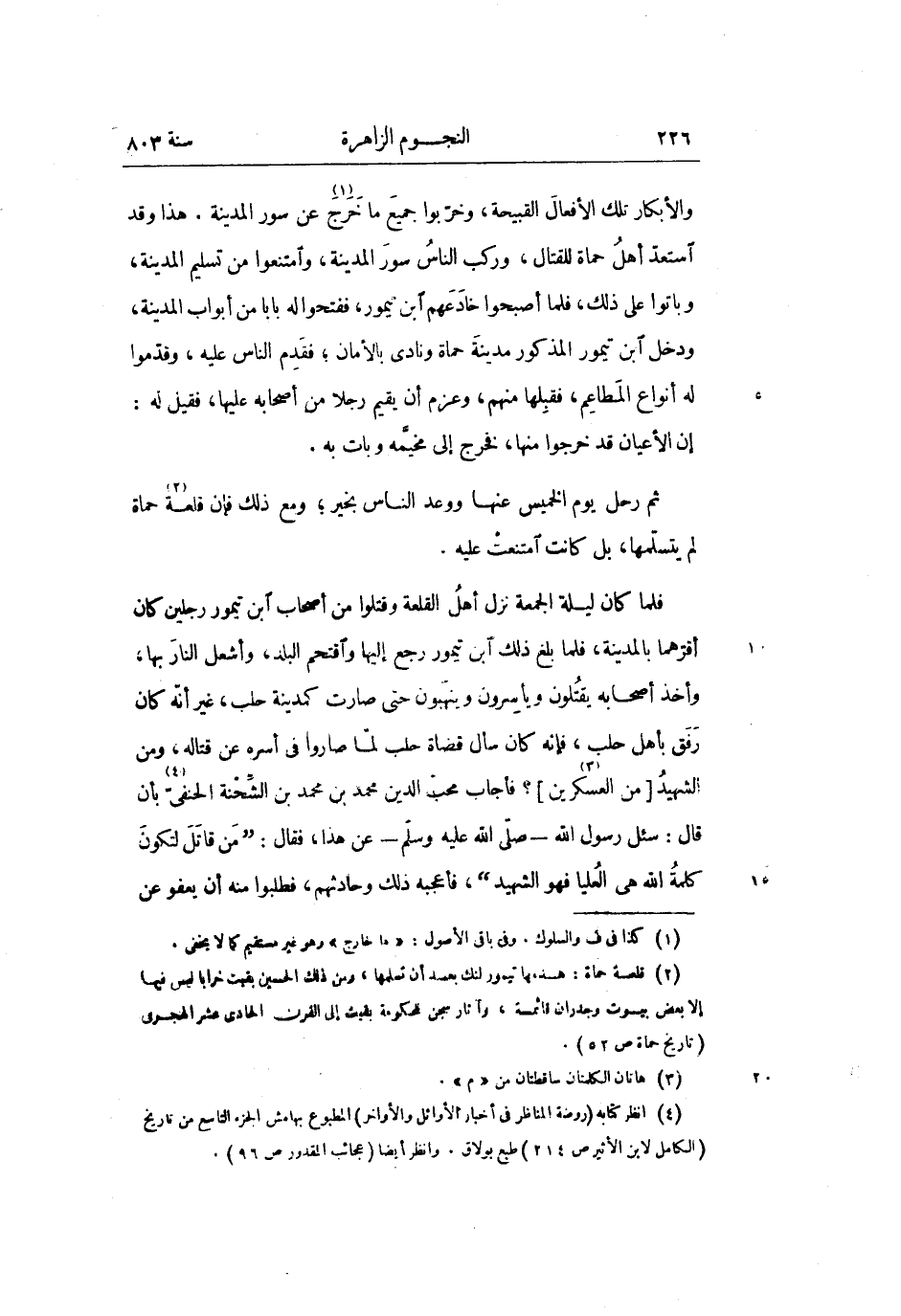 والأبكار تلك الأفعال القبيحة، وخرّبوا جميع ما خرج «1» عن سور المدينة. هذا وقد استعدّ أهل حماة للقتال، وركب الناس سور المدينة، وامتنعوا من تسليم المدينة، وباتوا على ذلك، فلما أصبحوا خادعهم ابن تيمور، ففتحوا له بابا من أبواب المدينة، ودخل ابن تيمور المذكور مدينة حماة ونادى بالأمان؛ فقدم الناس عليه، وقدّموا له أنواع المطاعم، فقبلها منهم، وعزم أن يقيم رجلا من أصحابه عليها، فقيل له: