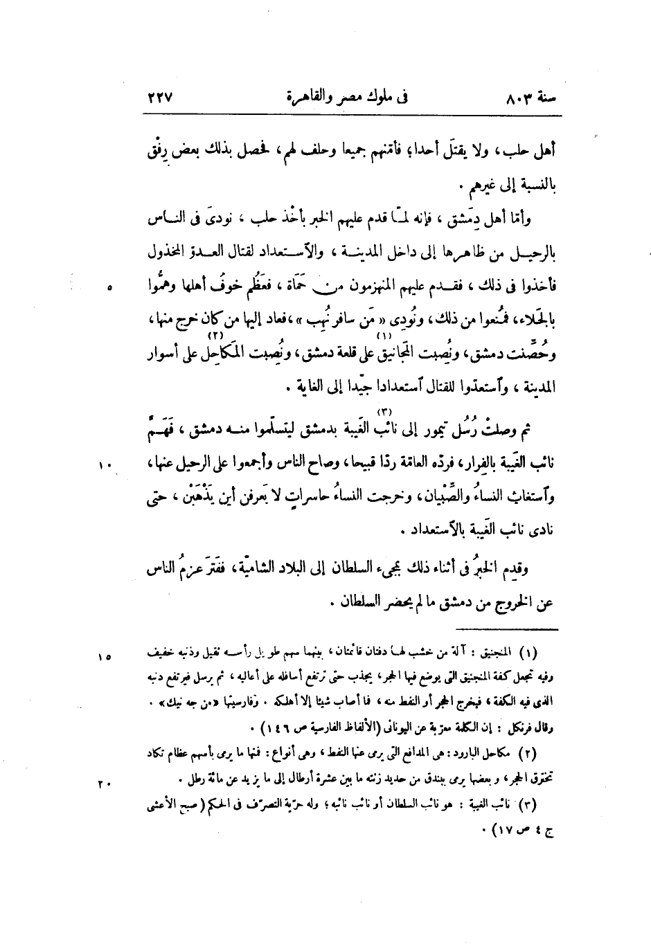 ثم وصلت رسل تيمور إلى نائب «3» الغيبة بدمشق ليتسلّموا منه دمشق، فهمّ نائب الغيبة بالفرار، فردّه العامّة ردّا قبيحا، وصاح الناس وأجمعوا على الرحيل عنها، واستغاث النساء والصّبيان، وخرجت النساء حاسرات لا بعرفن أين يذهبن، حتى نادى نائب الغيبة بالاستعداد.