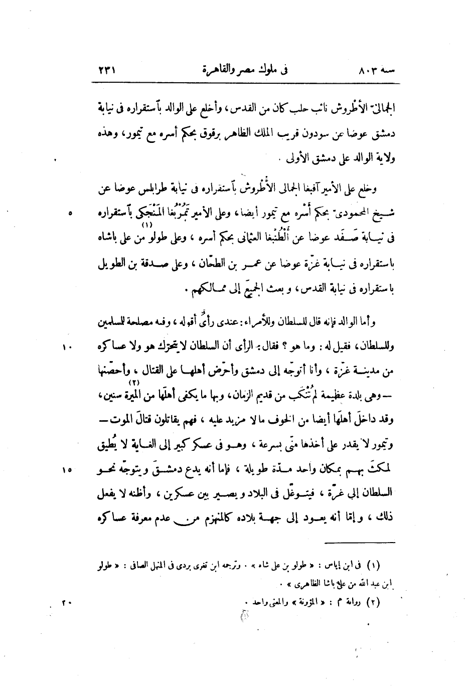 الجمالىّ الأطروش نائب حلب كان من القدس، وأخلع على الوالد باستقراره فى نيابة دمشق عوضا عن سودون قريب الملك الظاهر برقوق بحكم أسره مع تيمور، وهذه ولاية الوالد على دمشق الأولى.