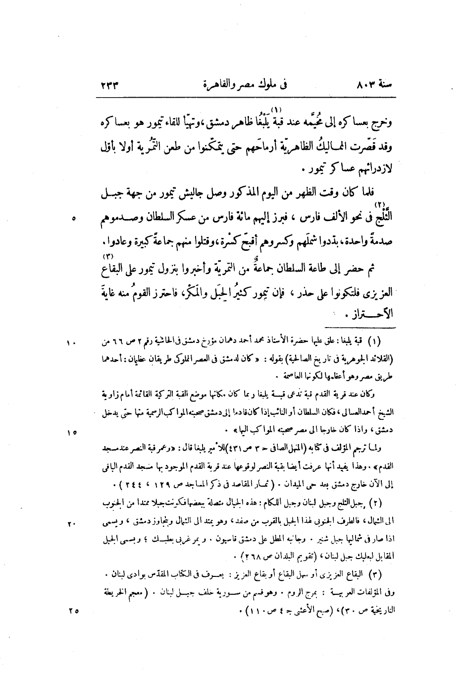 فلما كان وقت الظهر من اليوم المذكور وصل جاليش تيمور من جهة جبل الثّلج «2» فى نحو الألف فارس، فبرز إليهم مائة فارس من عسكر السلطان وصدموهم صدمة واحدة، بدّدوا شملهم وكسروهم أقبح كسرة، وقتلوا منهم جماعة كبيرة وعادوا.