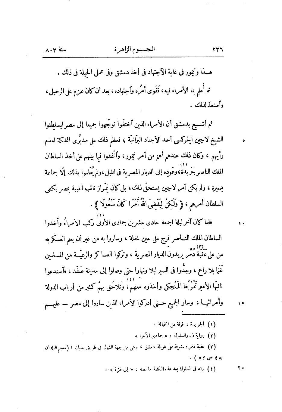 ثم أشيع بدمشق أن الأمراء الذين اختفوا توجّهوا جميعا إلى مصر ليسلطنوا الشيخ لاچين الچركسى أحد الأجناد البرّانيّة؛ فعظم ذلك على مدبّرى المملكة لعدم رأيهم، وكان ذلك عندهم أهمّ من أمر تيمور، واتّفقوا فيما بينهم على أخذ السلطان الملك الناصر جريدة «1» ، وعوده إلى الديار المصرية فى الليل، ولم يعلموا بذلك إلّا جماعة يسيرة، ولم يكن أمر لاچين يستحقّ ذلك، بل كان تمراز نائب الغيبة بمصر يكفى السلطان أمرهم، وَلكِنْ لِيَقْضِيَ اللَّهُ أَمْراً كانَ مَفْعُولًا.