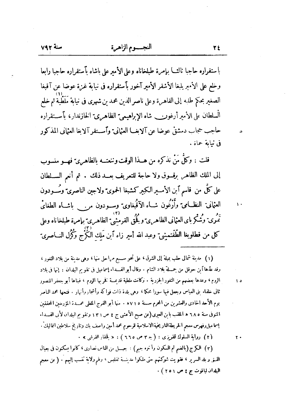 قلت: وكلّ من نذكره من هذا الوقت وننعته بالظاهرىّ فهو منسوب إلى الملك الظاهر برقوق ولا حاجة للتعريف بعد ذلك. ثم أنعم السلطان على كلّ من قاسم ابن الأمير الكبير كمشبغا الحموىّ ولاجين الناصرىّ وسودون العثمانىّ النظامىّ وأرغون شاه الآقبغاوىّ وسودون من باشاه الطغاى تمرىّ وشكرباى العثمانى الظاهرىّ وقجق القرمشىّ «2» الظاهرىّ بإمرة طبلخاناه وعلى كل من قطلوبغا الطّقتمشىّ وعبد الله أمير زاه ابن ملك الكرج «3» وكزل الناصرىّ