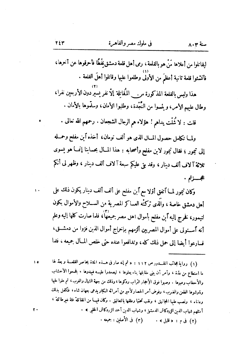 وكان تيمور لما اتفق أوّلا مع ابن مفلح على ألف ألف دينار يكون ذلك على أهل دمشق خاصة، والذي تركته العساكر المصرية من السلاح والأموال يكون لتيمور، فخرج إليه ابن مفلح بأموال اهل مصر جميعها «3» ، فلما صارت كلها إليه وعلم أنه استولى على أموال المصريين ألزمهم بإخراج أموال الذين فرّوا من دمشق، فسارعوا أيضا إلى حمل ذلك كله، وتدافعوا عنده حتى خلص المال جميعه، فلما