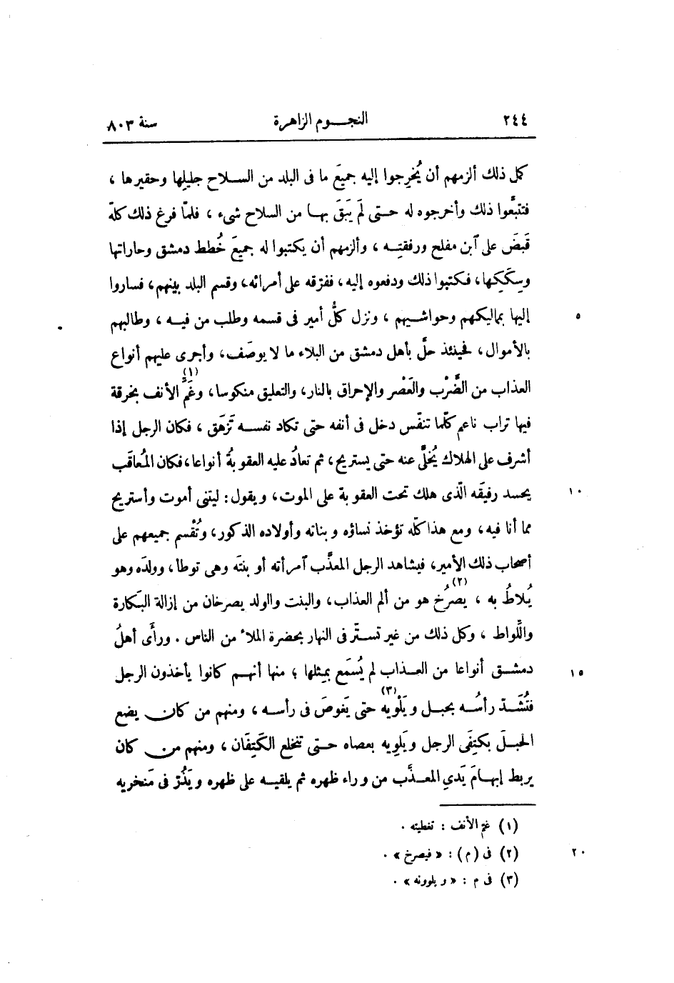 كمل ذلك ألزمهم أن يخرجوا إليه جميع ما فى البلد من السلاح جليلها وحقيرها، فتتبّعوا ذلك وأخرجوه له حتى لم يبق بها من السلاح شىء، فلمّا فرغ ذلك كلّه قبض على ابن مفلح ورفقته، وألزمهم أن يكتبوا له جميع خطط دمشق وحاراتها وسككها، فكتبوا ذلك ودفعوه إليه، ففرّقه على أمرائه، وقسم البلد بينهم، فساروا إليها بمماليكهم وحواشيهم، ونزل كلّ أمير فى قسمه وطلب من فيه، وطالبهم بالأموال، فحينئذ حلّ بأهل دمشق من البلاء ما لا يوصف، وأجرى عليهم أنواع العذاب من الضّرب والعصر والإحراق بالنار، والتعليق منكوسا، وغمّ «1» الأنف بخرقة فيها تراب ناعم كلّما تنفّس دخل فى أنفه حتى تكاد نفسه تزهق، فكان الرجل إذا أشرف على الهلاك يخلّى عنه حتى يستريح، ثم تعاد عليه العقوبة أنواعا، فكان المعاقب يحسد رفيقه الّذى هلك تحت العقوبة على الموت، ويقول: ليتنى أموت وأستريح مما أنا فيه، ومع هذا كلّه تؤخذ نساؤه وبناته وأولاده الذكور، وتقسم جميعهم على أصحاب ذلك الأمير، فيشاهد الرجل المعذّب امرأته أو بنته وهى توطأ، وولده وهو يلاط به، يصرخ «2» هو من ألم العذاب، والبنت والولد يصرخان من إزالة البكارة واللّواط، وكل ذلك من غير تستّر فى النهار بحضرة الملأ من الناس. ورأى أهل دمشق أنواعا من العذاب لم يسمع بمثلها؛ منها أنهم كانوا يأخذون الرجل فتشدّ رأسه بحبل ويلويه «3» حتى يغوص فى رأسه، ومنهم من كان يضع الحبل بكتفى الرجل ويلويه بعصاه حتى تنخلع الكتفان، ومنهم من كان يربط إبهام يدى المعذّب من وراء ظهره ثم يلقيه على ظهره ويذرّ فى منخريه
