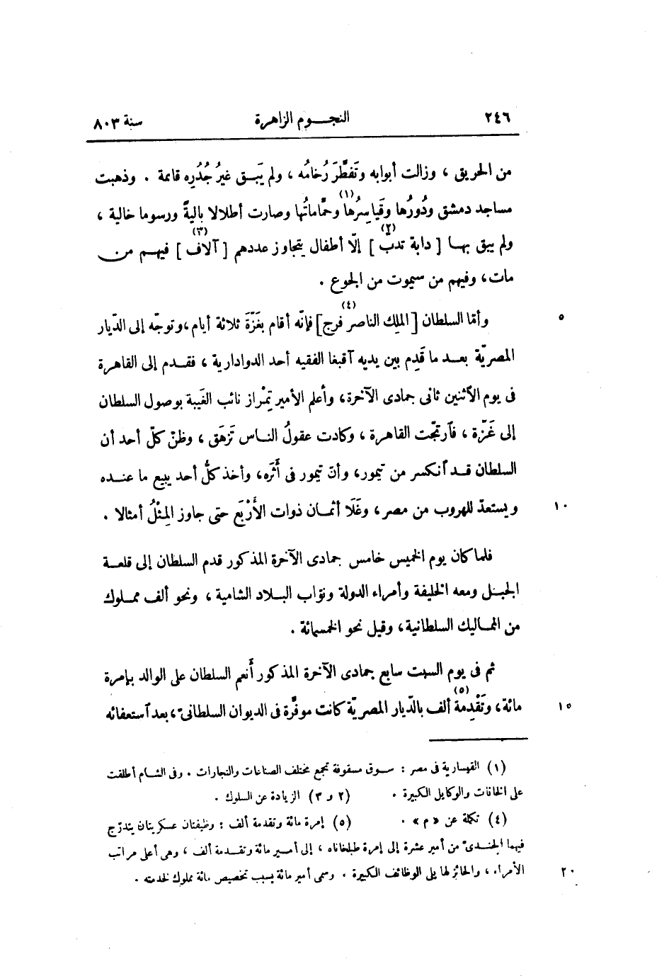 وأمّا السلطان [الملك الناصر «4» فرج] فإنّه أقام بغزّة ثلاثة أيام، وتوجّه إلى الدّيار المصريّة بعد ما قدم بين يديه آقبغا الفقيه أحد الدوادارية، فقدم إلى القاهرة فى يوم الاثنين ثانى جمادى الآخرة، وأعلم الأمير تمراز نائب الغيبة بوصول السلطان إلى غزّة، فارتجّت القاهرة، وكادت عقول الناس تزهق، وظنّ كلّ أحد أن السلطان قد انكسر من تيمور، وأنّ تيمور فى أثره، وأخذ كلّ أحد يبيع ما عنده ويستعدّ للهروب من مصر، وغلا أثمان ذوات الأربع حتى جاوز المثل أمثالا.