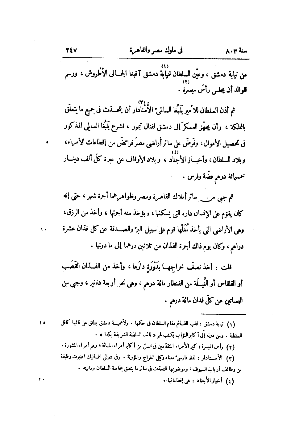 ثم أذن السلطان للأمير يلبغا السالمىّ الأستادار «3» أن يتحدّث فى جميع ما يتعلّق بالمملكة، وأن يجهّز العسكر إلى دمشق لقتال تيمور، فشرع يلبغا السالمى المذكور فى تحصيل الأموال، وفرض على سائر أراضى مصر فرائض من إقطاعات الأمراء، وبلاد السلطان، وأخباز الأجناد «4» ، وبلاد الأوقاف عن عبرة كلّ ألف دينار خمسمائة درهم فضّة وفرس.