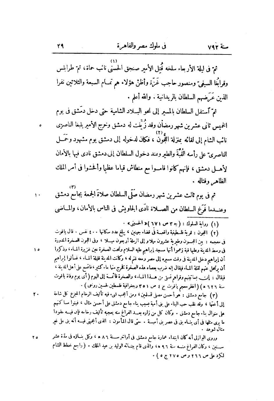 ثم فى يوم ثالث عشرين شهر رمضان صلّى السلطان صلاة الجمعة بجامع «3» دمشق وعند ما فرغ السلطان من الصلاة نادى الجاويش فى الناس بالأمان، والماضى