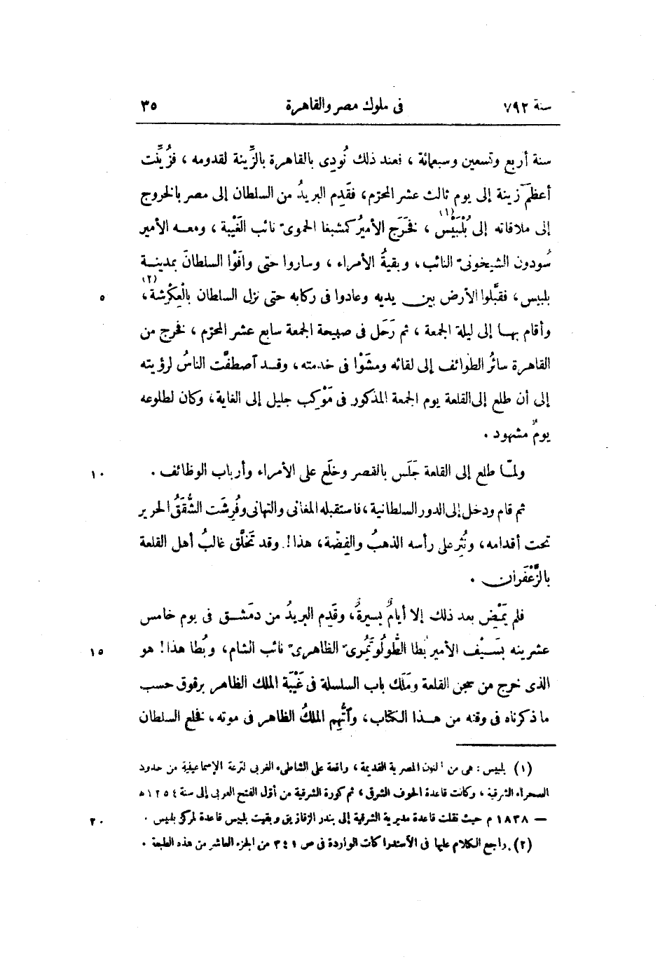 سنة أربع وتسعين وسبعمائة، فعند ذلك نودى بالقاهرة بالزّينة لقدومه، فزيّنت أعظم زينة إلى يوم ثالث عشر المحرّم، فقدم البريد من السلطان إلى مصر بالخروج إلى ملاقاته إلى بلبيس «1» ، فخرج الأمير كمشبغا الحموىّ نائب الغيبة، ومعه الأمير سودون الشيخونىّ النائب، وبقية الأمراء، وساروا حتى وافوا السلطان بمدينة بلبيس، فقبّلوا الأرض بين يديه وعادوا فى ركابه حتى نزل السلطان بالعكرشة «2» ، وأقام بها إلى ليلة الجمعة، ثم رحل فى صبيحة الجمعة سابع عشر المحرّم، فخرج من القاهرة سائر الطوائف إلى لقائه ومشوا فى خدمته، وقد اصطفّت الناس لرؤيته إلى أن طلع إلى القلعة يوم الجمعة المذكور فى موكب جليل إلى الغاية، وكان لطلوعه يوم مشهود.