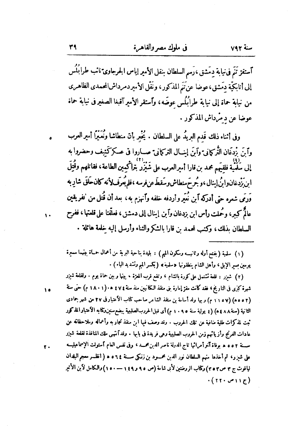 وفى أثناء ذلك قدم البريد على السلطان. يخبر بأنّ منطاشا ونعيرا أمير العرب وابن بزدغان التّركمانىّ وابن إينال التركمانىّ صاروا فى عسكر كثيف وحضروا به إلى سلمية «1» فلقيهم محمد بن قارا أمير العرب على شيزر «2» بتراكمين الطاعة، فقاتلهم وقتل ابن بزدغان وابن إينال، وجرح منطاش وسقط عن فرسه، فلم يعرف لأنه كان حلق شاربه ورمى شعره حتى أدركه ابن نعير وأردفه خلفه وانهزم به، بعد أن قتل من الفريقين عالم كبير، وحملت رأس ابن بزدغان وابن إينال إلى دمشق، فعلّقتا على قلعتها، ففرح السلطان بذلك، وكتب لمحمد بن قارا بالشكر والثناء وأرسل إليه خلعة هائلة.