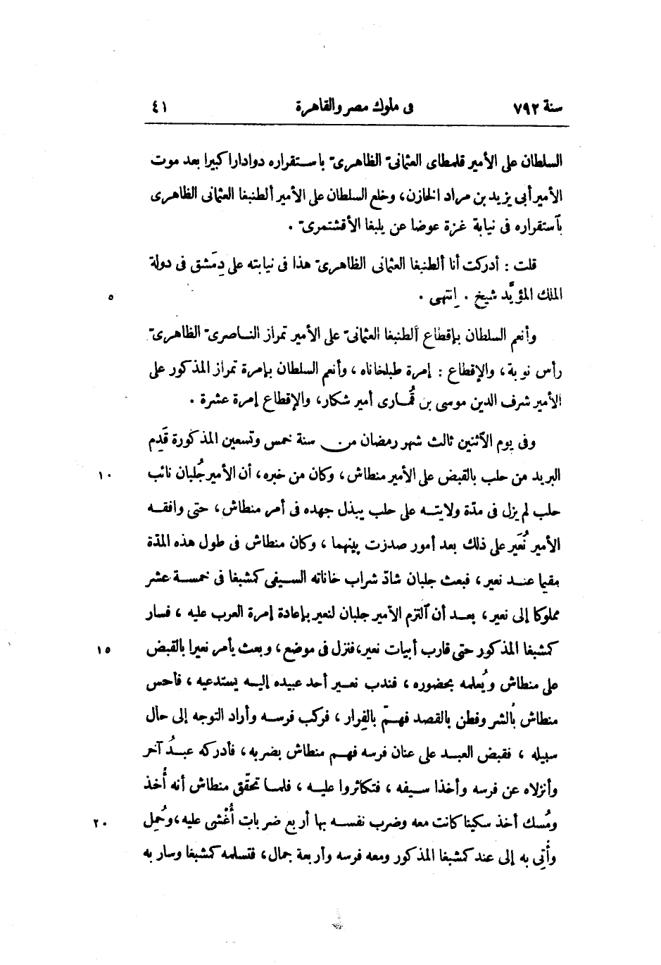وفى يوم الاثنين ثالث شهر رمضان من سنة خمس وتسعين المذكورة قدم البريد من حلب بالقبض على الأمير منطاش، وكان من خبره، أن الأمير جلبان نائب حلب لم يزل فى مدّة ولايته على حلب يبذل جهده فى أمر منطاش، حتى وافقه الأمير نعير على ذلك بعد أمور صدرت بينهما، وكان منطاش فى طول هذه المدّة مقيما عند نعير، فبعث جلبان شادّ شراب خاناته السيفى كمشبغا فى خمسة عشر مملوكا إلى نعير، بعد أن التزم الأمير جلبان لنعير بإعادة إمرة العرب عليه، فسار كمشبغا المذكور حتى قارب أبيات نعير، فنزل فى موضع، وبعث يأمر نعيرا بالقبض على منطاش ويعلمه بحضوره، فندب نعير أحد عبيده إليه يستدعيه، فأحس منطاش بالشر وفطن بالقصد فهمّ بالفرار، فركب فرسه وأراد التوجه إلى حال سبيله، فقبض العبد على عنان فرسه فهم منطاش بضربه، فأدركه عبد آخر وأنزلاه عن فرسه وأخذا سيفه، فتكاثروا عليه، فلما تحقّق منطاش أنه أخذ ومسك أخذ سكينا كانت معه وضرب نفسه بها أربع ضربات أغشى عليه، وحمل وأتى به إلى عند كمشبغا المذكور ومعه فرسه وأربعة جمال، فتسلمه كمشبغا وسار به