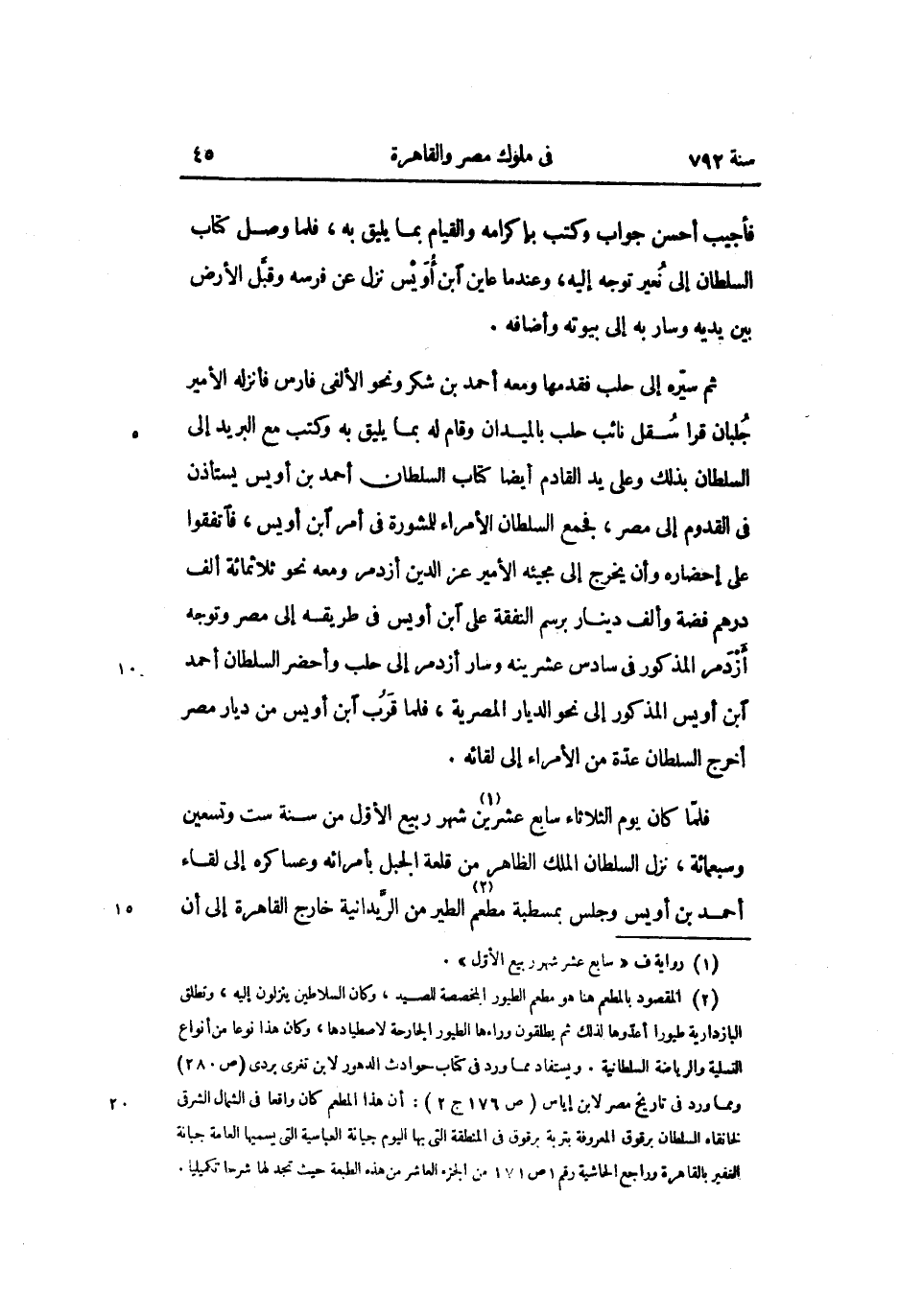 فلمّا كان يوم الثلاثاء سابع عشرين «1» شهر ربيع الأوّل من سنة ست وتسعين وسبعمائة، نزل السلطان الملك الظاهر من قلعة الجبل بأمرائه وعساكره إلى لقاء أحمد بن أويس وجلس بمسطبة مطعم «2» الطير من الرّيدانية خارج القاهرة إلى أن