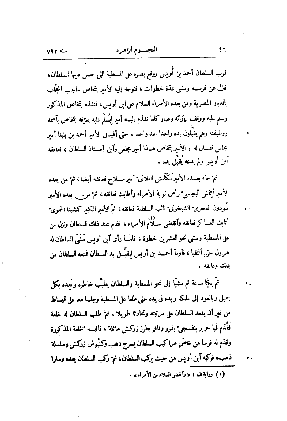 ثمّ بكيا ساعة ثم مشيا إلى نحو المسطبة والسلطان يطيّب خاطره ويعده بكل جميل وبالعود إلى ملكه ويده فى يده حتى طلعا على المسطبة وجلسا معا على البساط من غير أن يقعد السلطان على مرتبته وتحادثا طويلا، ثمّ طلب السلطان له خلعة فقدّم قبا حرير بنفسجىّ بفرو وقاقم بطرز زركش هائلة، فألبسه الخلعة المذكورة وقدّم له فرسا من خاصّ مراكيب السلطان بسرج ذهب وكنبوش زركش وسلسلة ذهب فركبه ابن أويس من حيث يركب السلطان، ثمّ ركب السلطان بعده وسارا