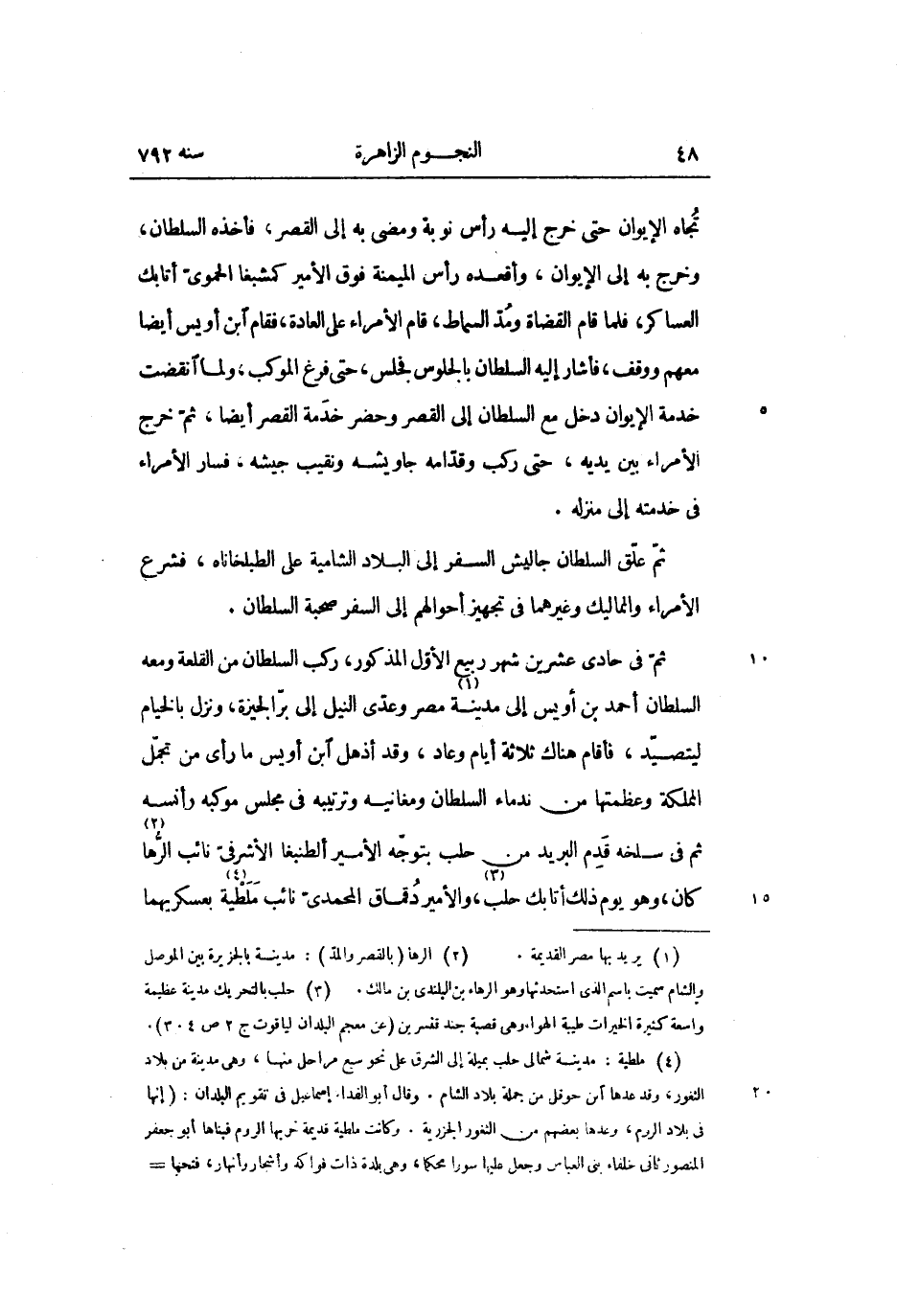 ثمّ فى حادى عشرين شهر ربيع الأوّل المذكور، ركب السلطان من القلعة ومعه السلطان أحمد بن أويس إلى مدينة «1» مصر وعدّى النيل إلى برّ الجيزة، ونزل بالخيام ليتصيّد، فأقام هناك ثلاثة أيام وعاد، وقد أذهل ابن أويس ما رأى من تجمّل المملكة وعظمتها من ندماء السلطان ومغانيه وترتيبه فى مجلس موكبه وأنسه ثم فى سلخه قدم البريد من حلب بتوجّه الأمير ألطنبغا الأشرفىّ نائب الرّها «2» كان، وهو يوم ذلك أتابك حلب «3» ، والأمير دقماق المحمدىّ نائب ملطية «4» بعسكريهما