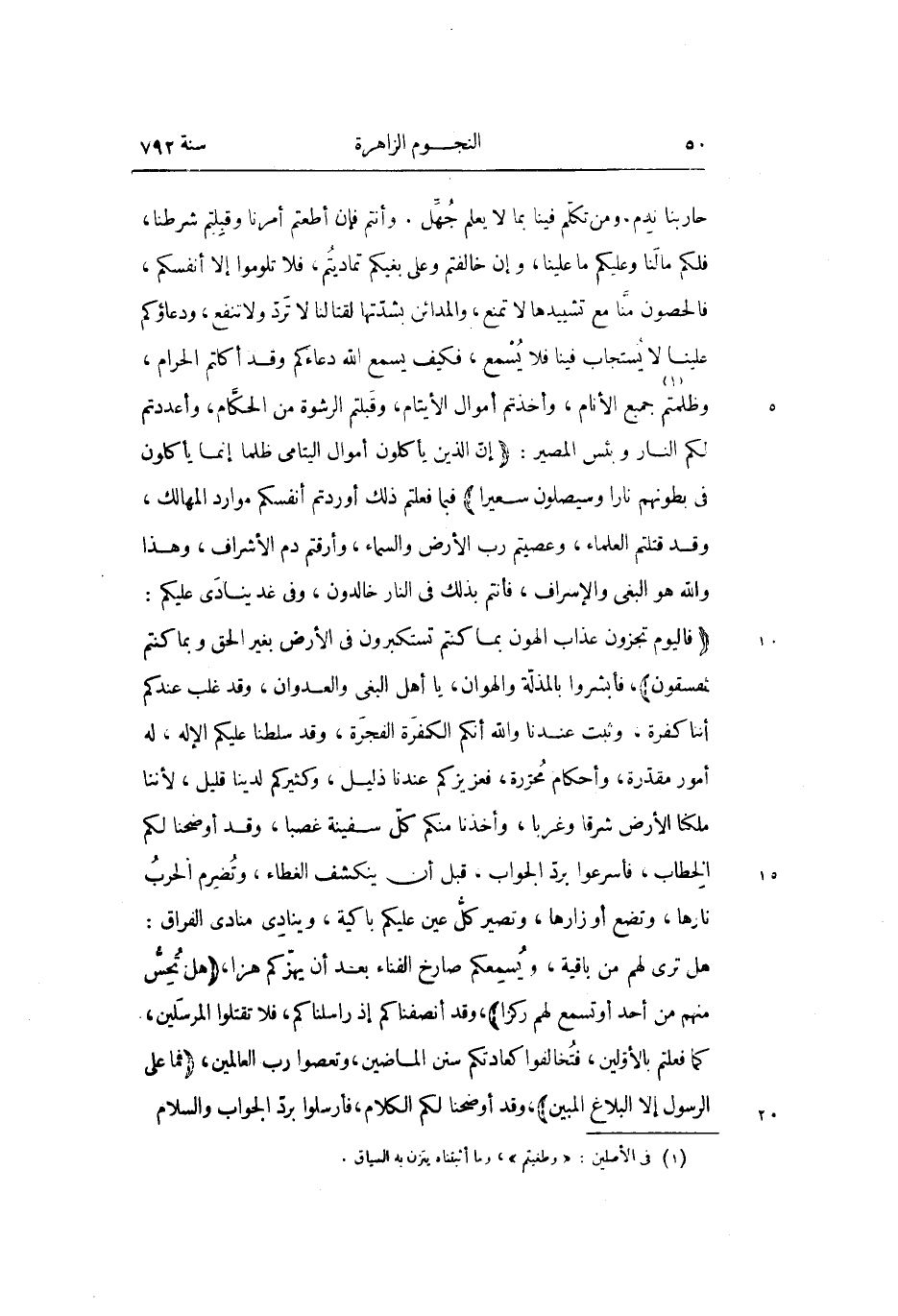 ، فأبشروا بالمذلّة والهوان، يا أهل البغى والعدوان، وقد غلب عندكم أننا كفرة، وثبت عندنا والله أنكم الكفرة الفجرة، وقد سلطنا عليكم الإله، له أمور مقدّرة، وأحكام محرّرة، فعزيزكم عندنا ذليل، وكثيركم لدينا قليل، لأننا ملكنا الأرض شرقا وغربا، وأخذنا منكم كلّ سفينة غصبا، وقد أوضحنا لكم الخطاب، فأسرعوا بردّ الجواب، قبل أن ينكشف الغطاء، وتضرم الحرب نارها، وتضع أو زارها، وتصير كلّ عين عليكم باكية، وينادى منادى الفراق: