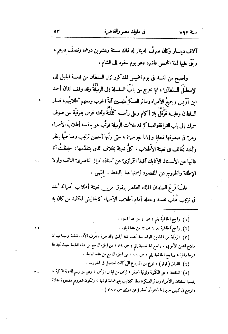 وأصبح من الغد فى يوم الخميس المذكور نزل السلطان من قلعة الجبل إلى الإسطبل «1» السلطانىّ، ثمّ خرج من باب «2» السلسلة إلى الرميلة «3» وقد وقف القان أحمد ابن أويس وجميع الأمراء وسائر العسكر ملبسين آلة الحرب ومعهم أطلابهم، فسار السلطان وعليه قرقل «4» بلا أكمام وعلى رأسه كلفتة «5» وتحته فرس بعرقيّة من صوف سميك إلى باب القرافة والعساكر قد ملأت الرّميلة فرتّب هو بنفسه أطلاب الأمراء ومرّ فى صفوفها ذهابا وإيابا غير مرّة، حتى رتّبها أحسن ترتيب وصاحبها ينظر وأخذ يخالف فى تعبئة الأطلاب، كلّ تعبئة بخلاف الذي يتقدّمها، حفظت أنا غالبها عن الأستاذ الأتابك آقبغا التمرازىّ عن أستاذه تمراز الناصرىّ النائب ولولا الإطالة والخروج عن المقصود لرسمتها هنا بالنقط. انتهى.