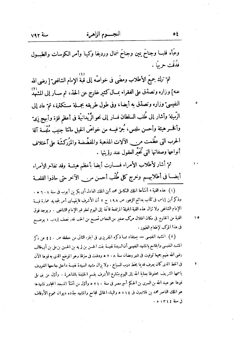 ثمّ ترك جميع الأطلاب ومضى فى خواصّه إلى قبة «1» الإمام الشافعىّ [رضى الله عنه] وزاره وتصدّق على الفقراء بمال كثير خارج عن الحدّ، ثم سار إلى المشهد «2» النفيسىّ وزاره وتصدّق به أيضا، وفى طول طريقه بجملة مستكثرة، ثمّ عاد إلى الرّميلة وأشار إلى طلب السلطان فسار إلى نحو الرّيدانيّة فى أعظم قوّة وأبهج زىّ وأفخر هيئة وأحسن ملبس، جرّ فيه من خواصّ الخيل مائتا جنيب ملبسة آلة الحرب التى عظمت من الآلات المذهبة والمفضّضة والمزركشة على اختلاف أنواعها وصفاتها التى تحيّر العقول عند رؤيتها.