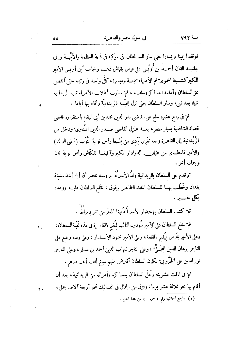 فوقفوا يمينا ويسارا حتى سار السلطان فى موكبه فى غاية العظمة والأبّهة وإلى جانبه القان أحمد بن أويس على فرس بقماش ذهب وبجانب ابن أويس الأمير الكبير كمشبغا الحموىّ ثم الأمراء ميمنة وميسرة، كلّ واحد فى رتبته حتى انقضى ممرّ السلطان وأمامه العساكر وخلفه، ثمّ سارت أطلاب الأمراء تريد الريدانية شيئا بعد شىء وسار السلطان حتى نزل بمخيّمه بالريدانيّة وأقام بها أياما.