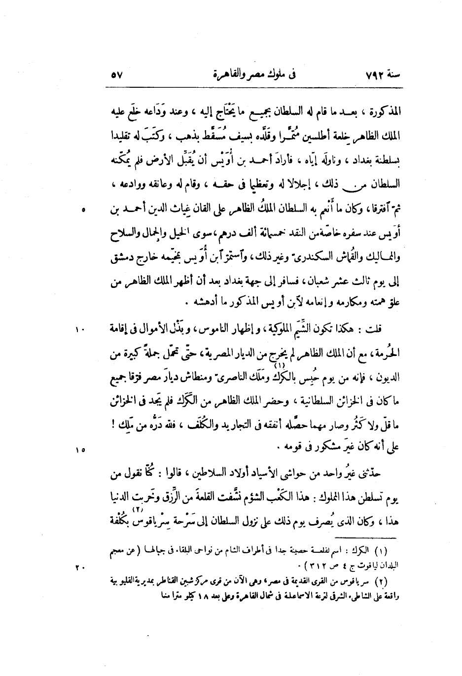 قلت: هكذا تكون الشّيم الملوكية، وإظهار الناموس، وبذل الأموال فى إقامة الحرمة، مع أن الملك الظاهر لم يخرج من الديار المصرية، حتّى تحمّل جملة كبيرة من الديون، فإنه من يوم حبس بالكرك «1» وملك الناصرىّ ومنطاش ديار مصر فرّقا جميع ما كان فى الخزائن السلطانية، وحضر الملك الظاهر من الكرك فلم يجد فى الخزائن ما قلّ ولا كثر وصار مهما حصّله أنفقه فى التجاريد والكلف، فلله درّه من ملك! على أنه كان غير مشكور فى قومه.