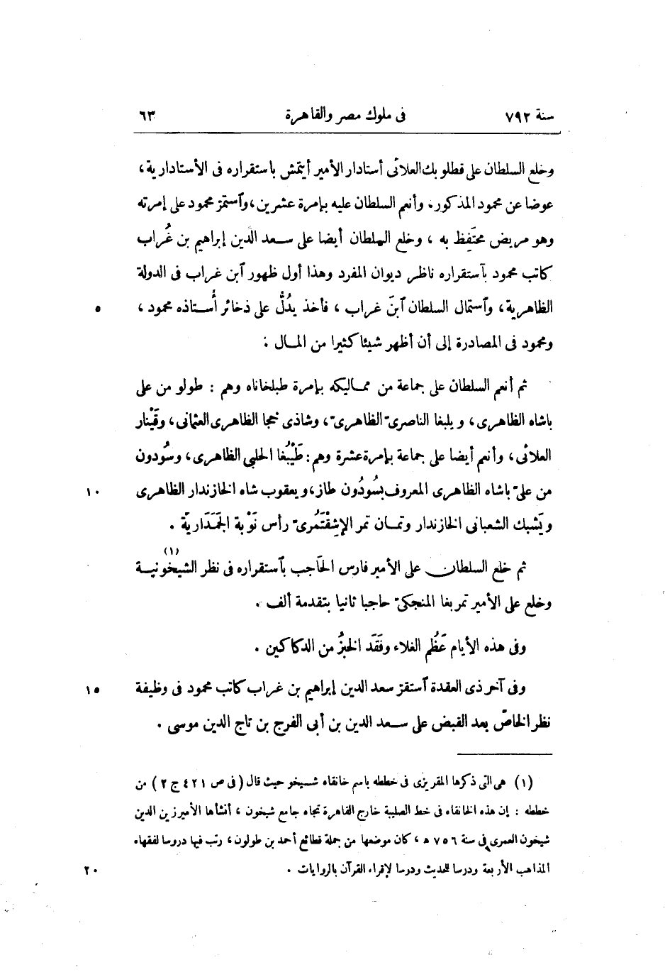 وفى آخر ذى العقدة استقرّ سعد الدين إبراهيم بن غراب كاتب محمود فى وظيفة نظر الخاصّ بعد القبض على سعد الدين بن أبى الفرج بن تاج الدين موسى.