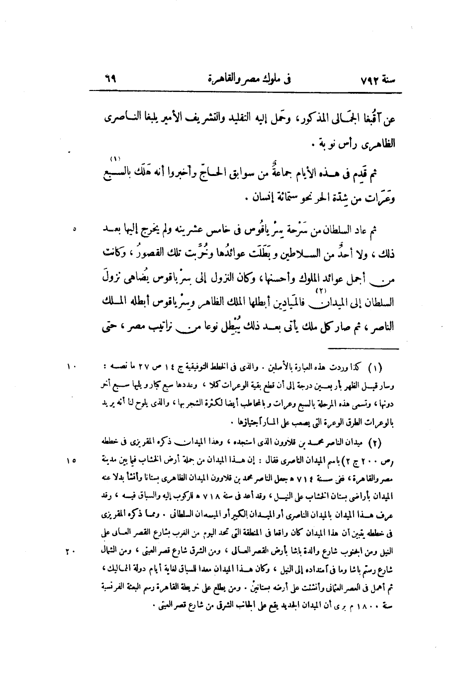 ثم عاد السلطان من سرحة سرياقوس فى خامس عشرينه ولم يخرج إليها بعد ذلك، ولا أحد من السلاطين وبطلت عوائدها وخرّبت تلك القصور، وكانت من أجمل عوائد الملوك وأحسنها، وكان النزول إلى سرياقوس يضاهى نزول السلطان إلى الميدان «2» فالميادين أبطلها الملك الظاهر وسرياقوس أبطله الملك الناصر، ثم صار كل ملك يأتى بعد ذلك يبطل نوعا من نراتيب مصر، حتى