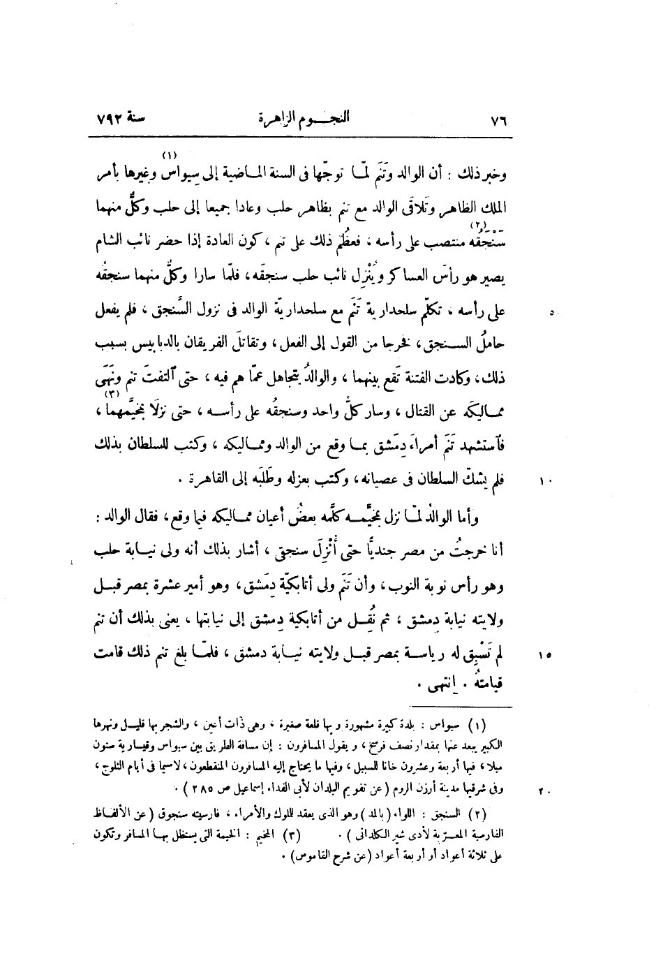 أنا خرجت من مصر جنديّا حتى أنزل سنجقى، أشار بذلك أنه ولى نيابة حلب وهو رأس نوبة النوب، وأن تنم ولى أتابكيّة دمشق، وهو أمير عشرة بمصر قبل ولايته نيابة دمشق، ثم نقل من أتابكية دمشق إلى نيابتها، يعنى بذلك أن تنم لم تسبق له رياسة بمصر قبل ولايته نيابة دمشق، فلمّا بلغ تنم ذلك قامت قيامته. انتهى.