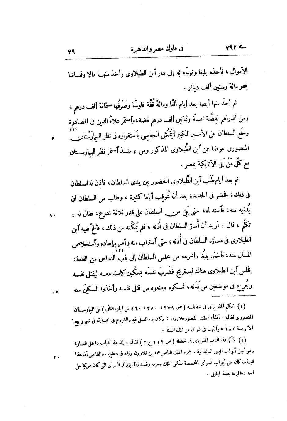 تكلّم، قال: أريد أن أسارّ السلطان فى أذنه، فلم يمكّنه من ذلك، فألّح عليه ابن الطبلاوى فى مسارّة السلطان فى أذنه، حتى استراب منه وأمر بإبعاده واستخلاص المال منه، فأخذه يلبغا وأخرجه من مجلس السلطان إلى باب «2» النحاس من القلعة، فجلس ابن الطبلاوى هناك ليستريح فضرب نفسه بسكّين كانت معه ليقتل نفسه وجرح فى موضعين من بدنه، فمسكوه ومنعوه من قتل نفسه وأخذوا السكين منه