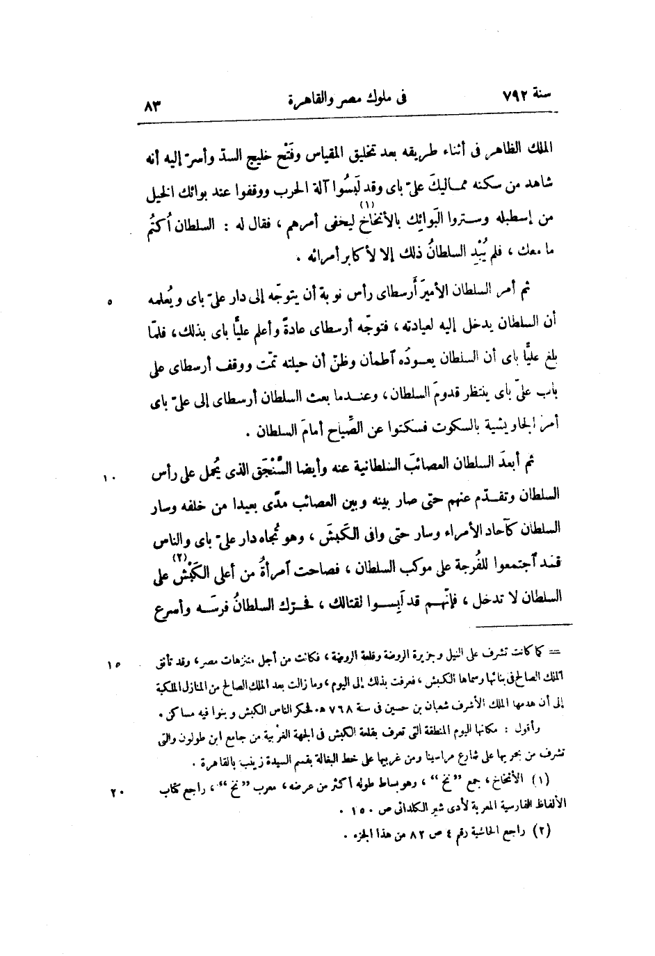 الملك الظاهر فى أثناء طريقه بعد تخليق المقياس وفتح خليج السدّ وأسرّ إليه أنه شاهد من سكنه مماليك علىّ باى وقد لبسوا آلة الحرب ووقفوا عند بوائك الخيل من إسطبله وستروا البوائك بالأنخاخ «1» ليخفى أمرهم، فقال له: السلطان اكتم ما معك، فلم يبد السلطان ذلك إلا لأكابر أمرائه.