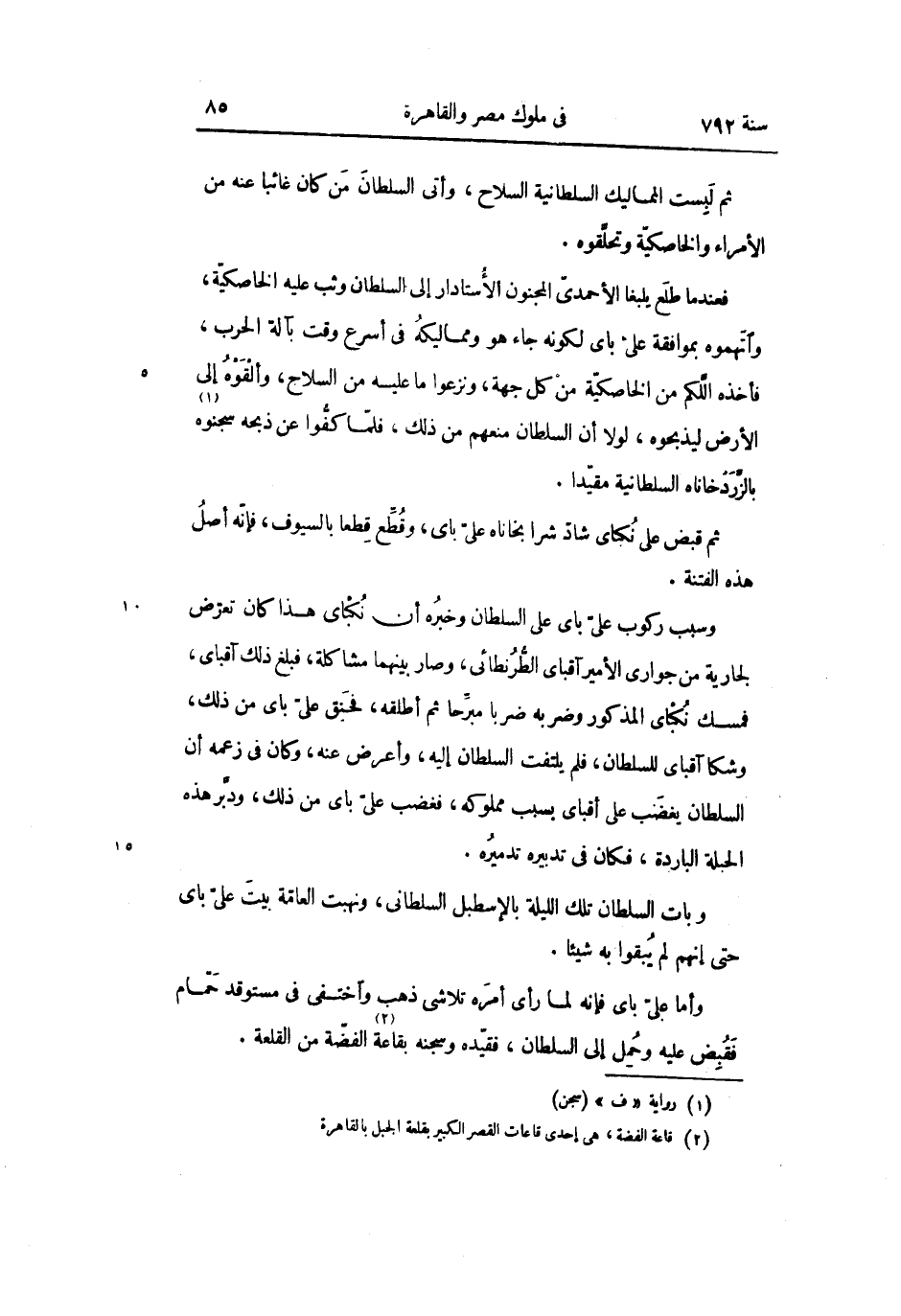 وأما علىّ باى فإنه لما رأى أمره تلاشى ذهب واختفى فى مستوقد حمّام فقبض عليه وحمل إلى السلطان، فقيّده وسجنه بقاعة «2» الفضّة من القلعة.