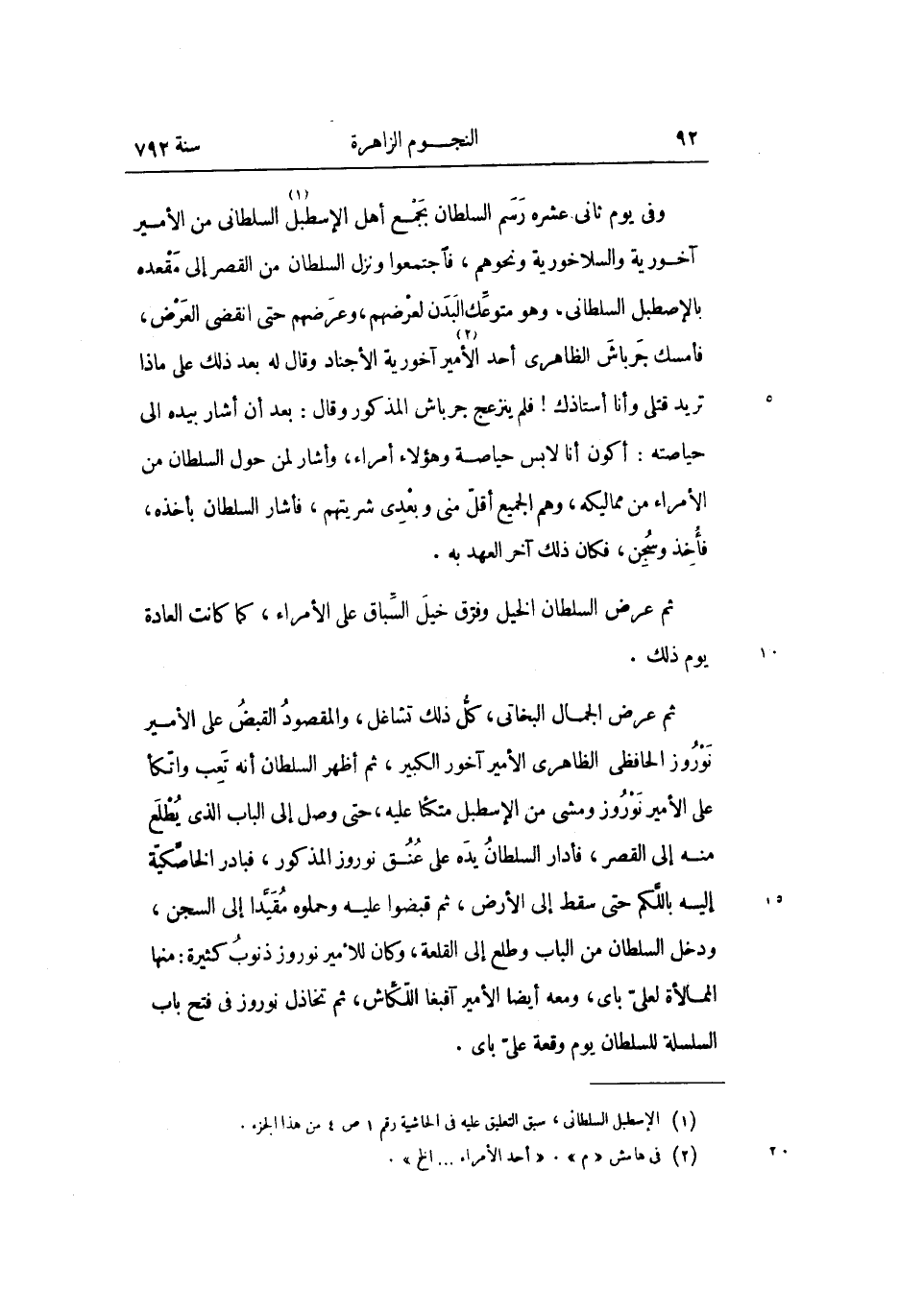 وفى يوم ثانى عشره رسم السلطان بجمع أهل الإسطبل «1» السلطانى من الأمير آخورية والسلاخورية ونحوهم، فاجتمعوا ونزل السلطان من القصر إلى مقعده بالإصطبل السلطانى، وهو متوعّك البدن لعرضهم، وعرضهم حتى انقضى العرض، فأمسك جرباش الظاهرى أحد الأمير «2» آخورية الأجناد وقال له بعد ذلك على ماذا تريد قتلى وأنا أستاذك! فلم ينزعج جرباش المذكور وقال: بعد أن أشار بيده الى حياصته: أكون أنا لابس حياصة وهؤلاء أمراء، وأشار لمن حول السلطان من الأمراء من مماليكه، وهم الجميع أقلّ منى وبعدى شريتهم، فأشار السلطان بأخذه، فأخذ وسجن، فكان ذلك آخر العهد به.