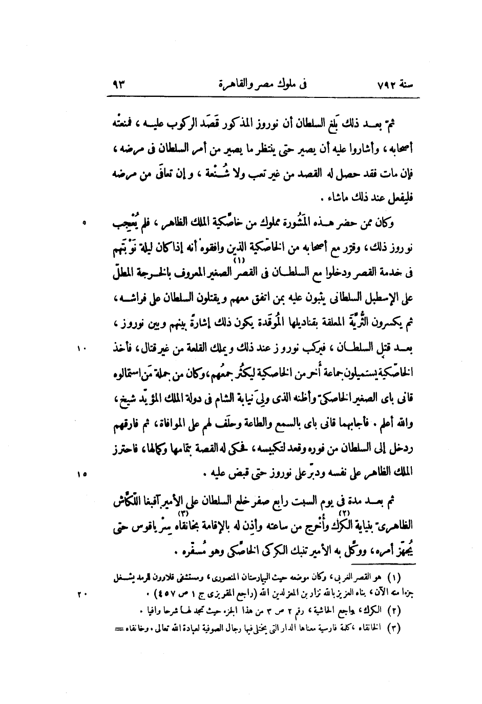 ثمّ بعد ذلك بلغ السلطان أن نوروز المذكور قصد الركوب عليه، فمنعته أصحابه، وأشاروا عليه أن يصير حتى ينتظر ما يصير من أمر السلطان فى مرضه، فإن مات فقد حصل له القصد من غير تعب ولا شنعة، وإن تعافى من مرضه فليفعل عند ذلك ما شاء.