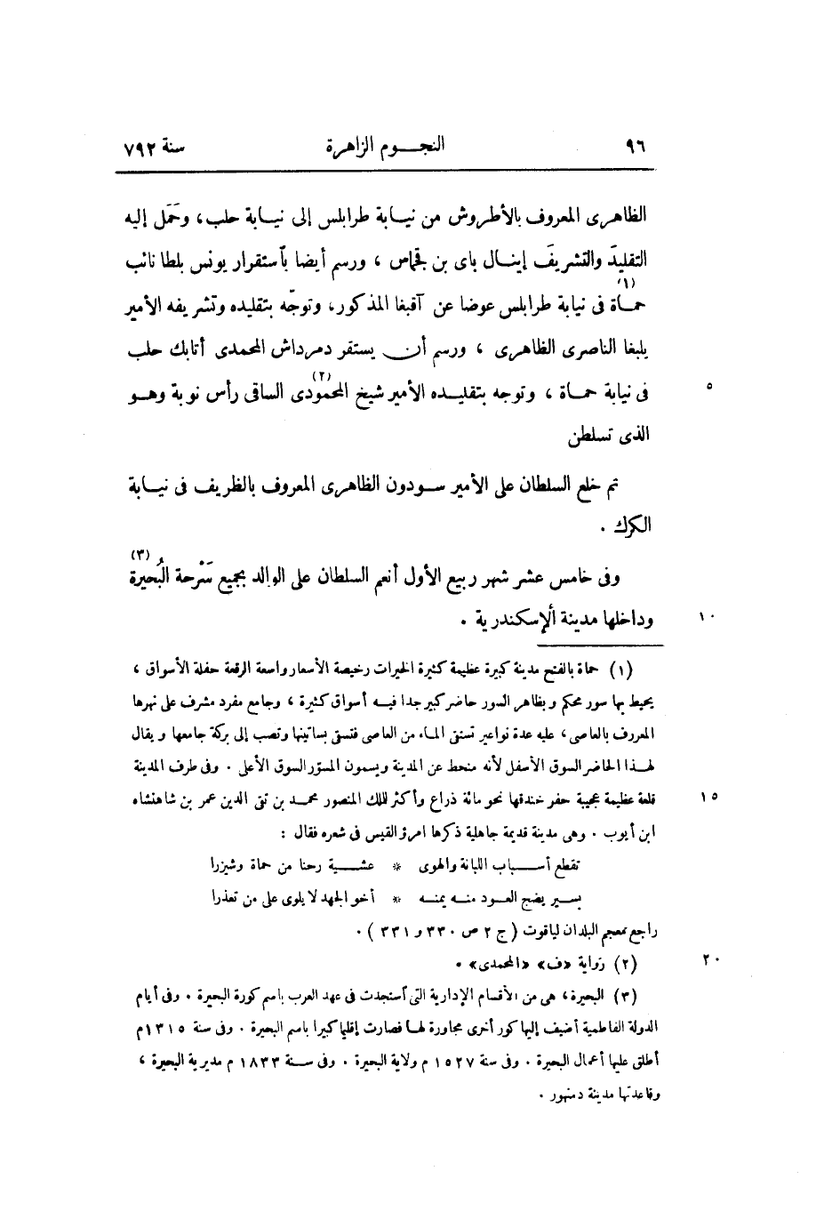 الظاهرى المعروف بالأطروش من نيابة طرابلس إلى نيابة حلب، وحمل إليه التقليد والتشريف إينال باى بن قجماس، ورسم أيضا باستقرار يونس بلطا نائب حماة «1» فى نيابة طرابلس عوضا عن آقبغا المذكور، وتوجّه بتقليده وتشريفه الأمير يلبغا الناصرى الظاهرى، ورسم أن يستقر دمرداش المحمدى أتابك حلب فى نيابة حماة، وتوجه بتقليده الأمير شيخ المحمودى «2» الساقى رأس نوبة وهو الذي تسلطن