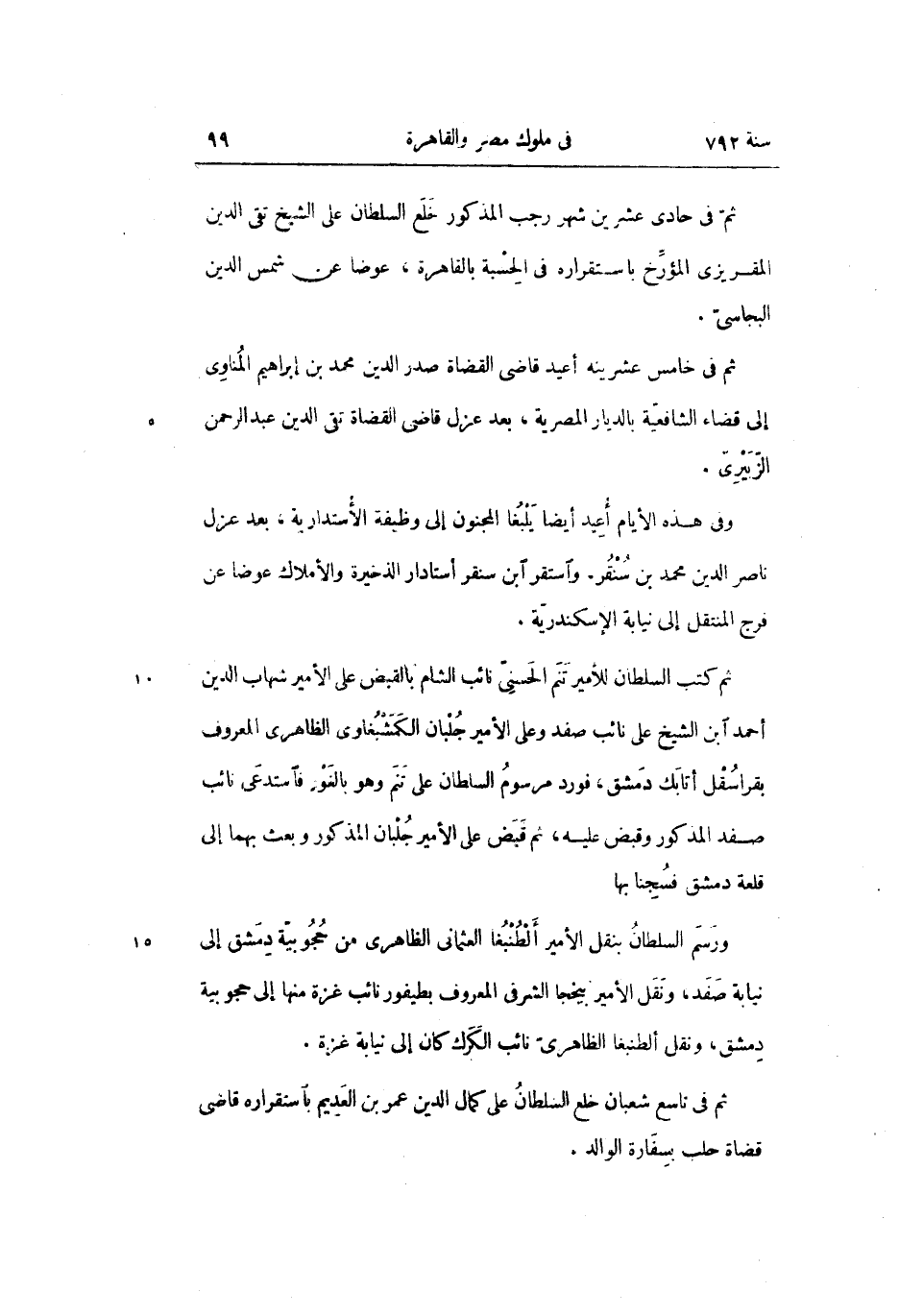 ثمّ فى حادى عشرين شهر رجب المذكور خلع السلطان على الشيخ تقي الدين المقريزى المؤرّخ باستقراره فى الحسبة بالقاهرة، عوضا عن شمس الدين البجاسىّ.