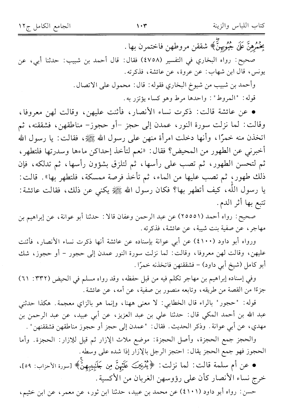 ورواه أبو داود (٤١٠٠) عن أبي عوانة بإسناده عن عائشة أنها ذكرت نساء الأنصار، فأثنت عليهن، وقالت لهن معروفا، وقالت: لما نزلت سورة النور عمدن إلى حجور -أو حجوز، شك أبو كامل (شيخ أبي داود) - فشققنهن فاتخذنه خمرًا.