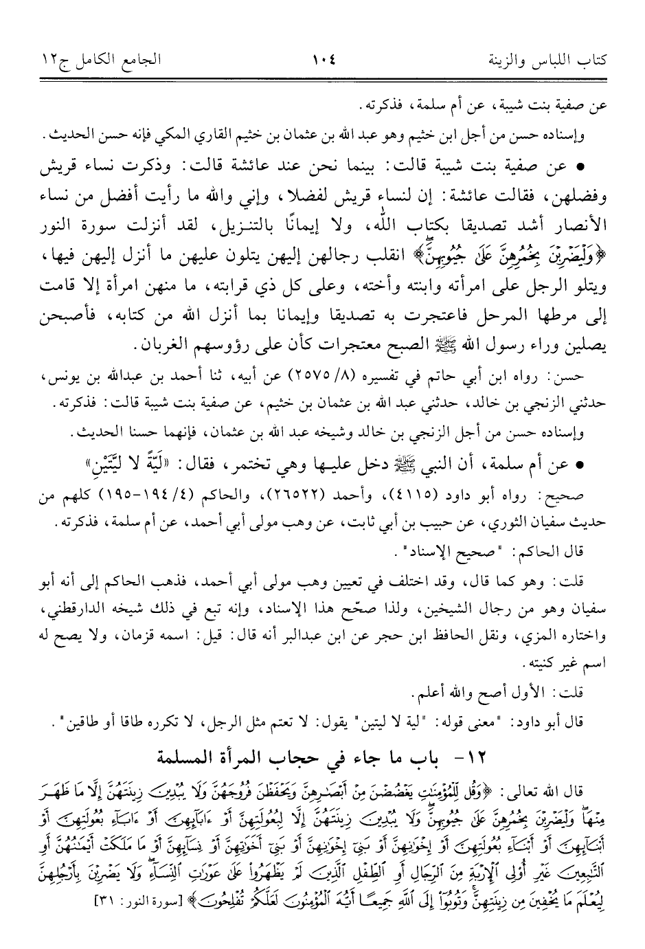 • عن صفية بنت شيبة قالت: بينما نحن عند عائشة قالت: وذكرت نساء قريش وفضلهن، فقالت عائشة: إن لنساء قريش لفضلا، وإني واللَّه ما رأيت أفضل من نساء الأنصار أشد تصديقا بكتاب اللَّه، ولا إيمانًا بالتنزيل، لقد أنزلت سورة النور {وَلْيَضْرِبْنَ بِخُمُرِهِنَّ عَلَى جُيُوبِهِنَّ} انقلب رجالهن إليهن يتلون عليهن ما أنزل إليهن فيها، ويتلو الرجل على امرأته وابنته وأخته، وعلى كل ذي قرابته، ما منهن امرأة إلا قامت إلى مرطها المرحل فاعتجرت به تصديقا وإيمانا بما أنزل اللَّه من كتابه، فأصبحن يصلين وراء رسول اللَّه -صلى اللَّه عليه وسلم- الصبح معتجرات كأن على رؤوسهم الغربان.