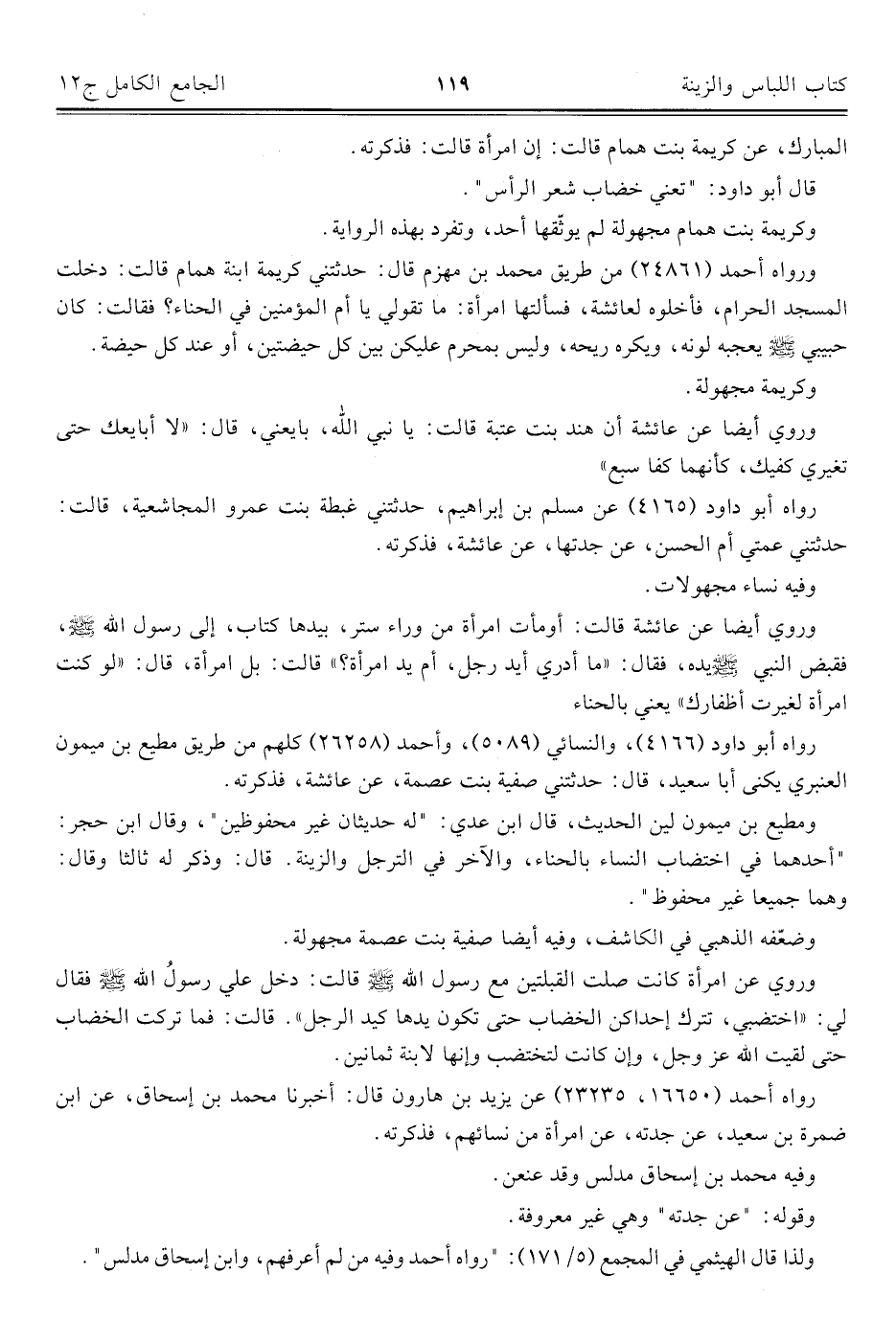 وروي أيضًا عن عائشة قالت: أومأت امرأة من وراء ستر، بيدها كتاب، إلى رسول اللَّه -صلى اللَّه عليه وسلم-، فقبض النبي -صلى اللَّه عليه وسلم- يده، فقال: "ما أدري أيد رجل، أم يد امرأة؟ " قالت: بل امرأة، قال: "لو كنت امرأة لغيرت أظفارك" يعني بالحناء