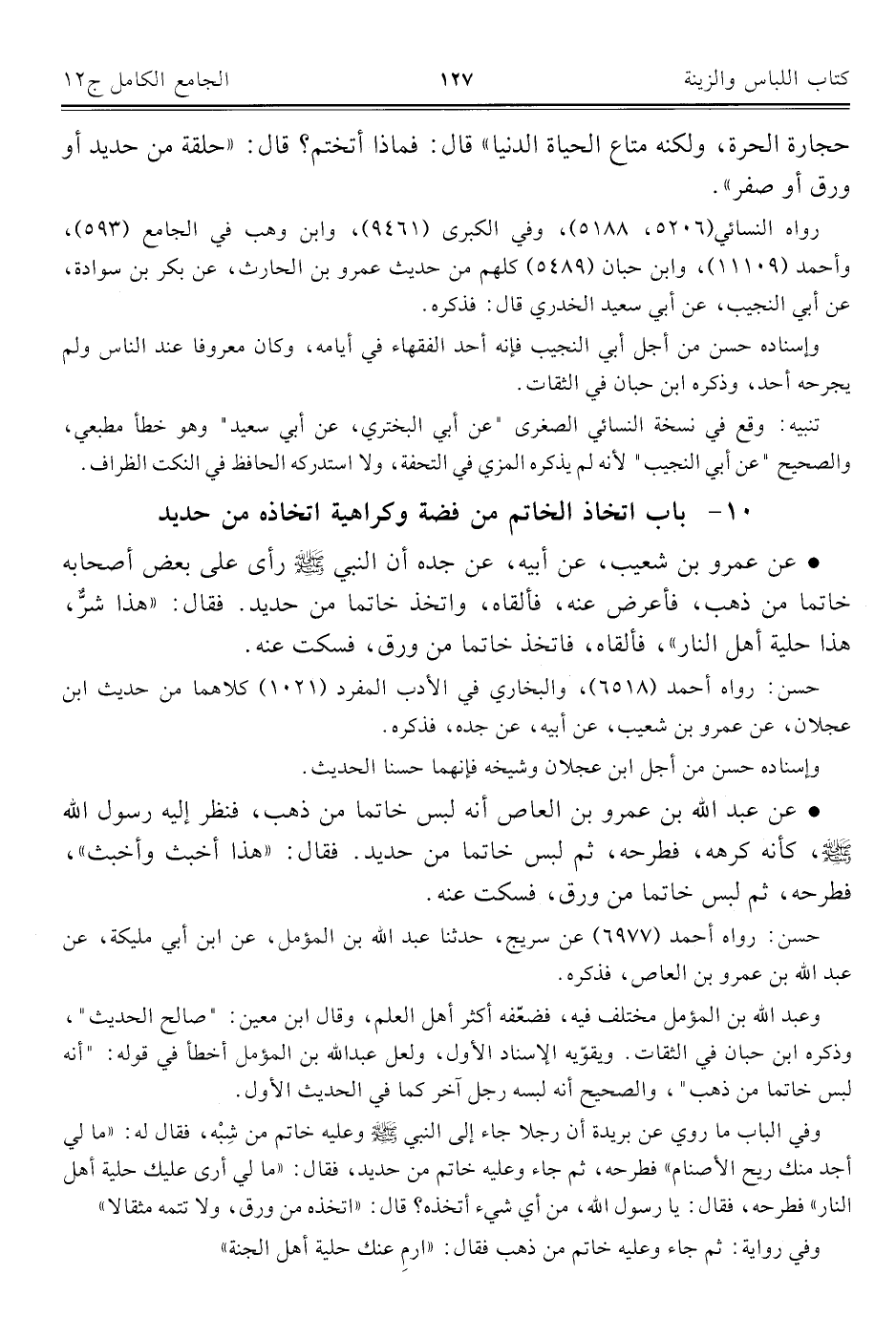 • عن عمرو بن شعيب، عن أبيه، عن جده أن النبي -صلى اللَّه عليه وسلم- رأى على بعض أصحابه خاتما من ذهب، فأعرض عنه، فألقاه، واتخذ خاتما من حديد. فقال: "هذا شرٌّ، هذا حلية أهل النار"، فألقاه، فاتخذ خاتما من ورق، فسكت عنه.