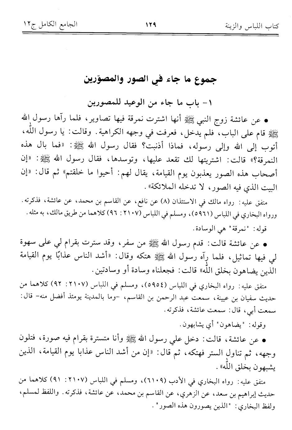 • عن عائشة، قالت: دخل علي رسول اللَّه -صلى اللَّه عليه وسلم- وأنا متسترة بقرام فيه صورة، فتلون وجهه، ثم تناول الستر فهتكه، ثم قال: "إن من أشد الناس عذابا يوم القيامة، الذين يشبهون بخلق اللَّه".