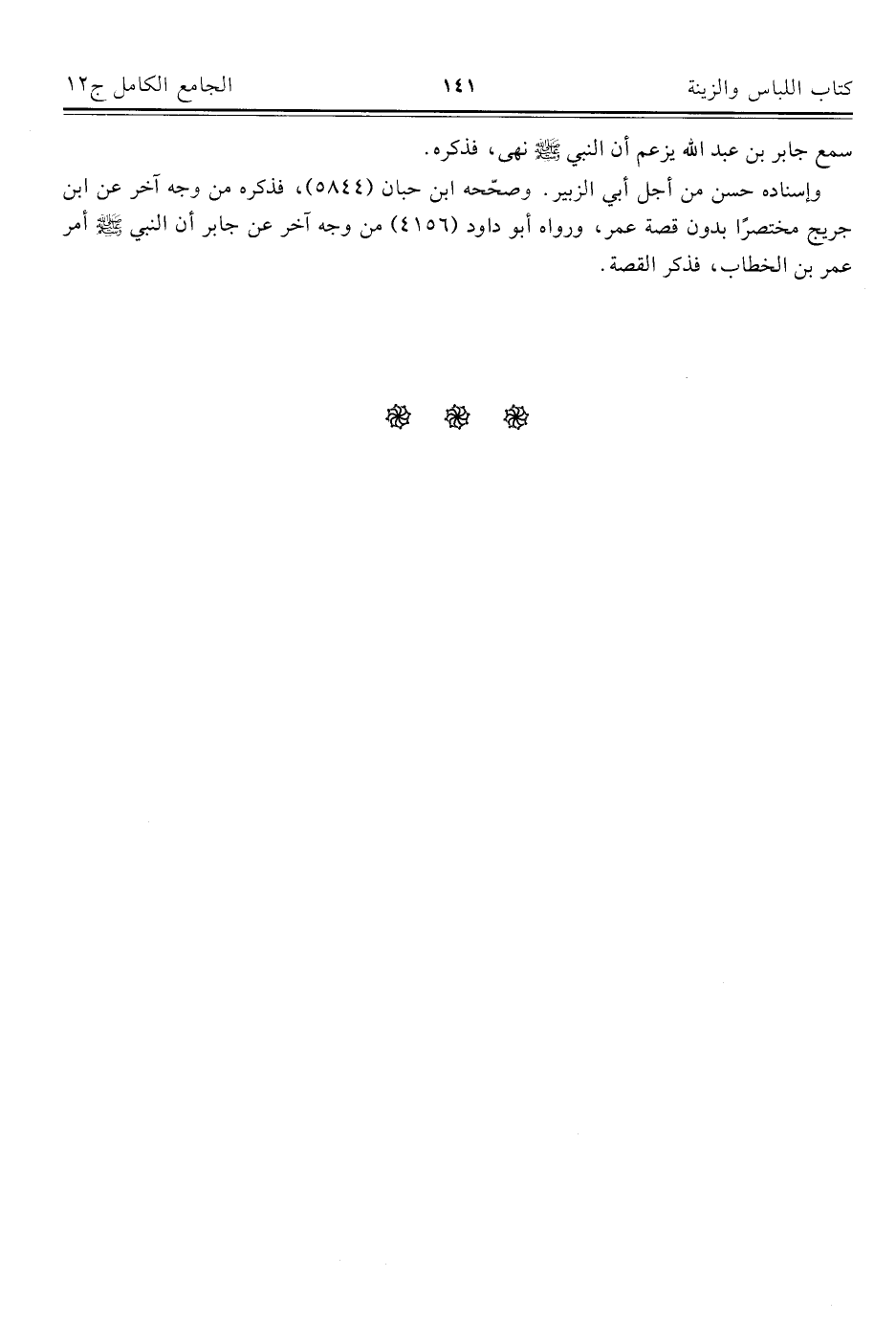 وإسناده حسن من أجل أبي الزبير. وصحّحه ابن حبان (٥٨٤٤)، فذكره من وجه آخر عن ابن جريج مختصرًا بدون قصة عمر، ورواه أبو داود (٤١٥٦) من وجه آخر عن جابر أن النبي -صلى اللَّه عليه وسلم- أمر عمر بن الخطاب، فذكر القصة.